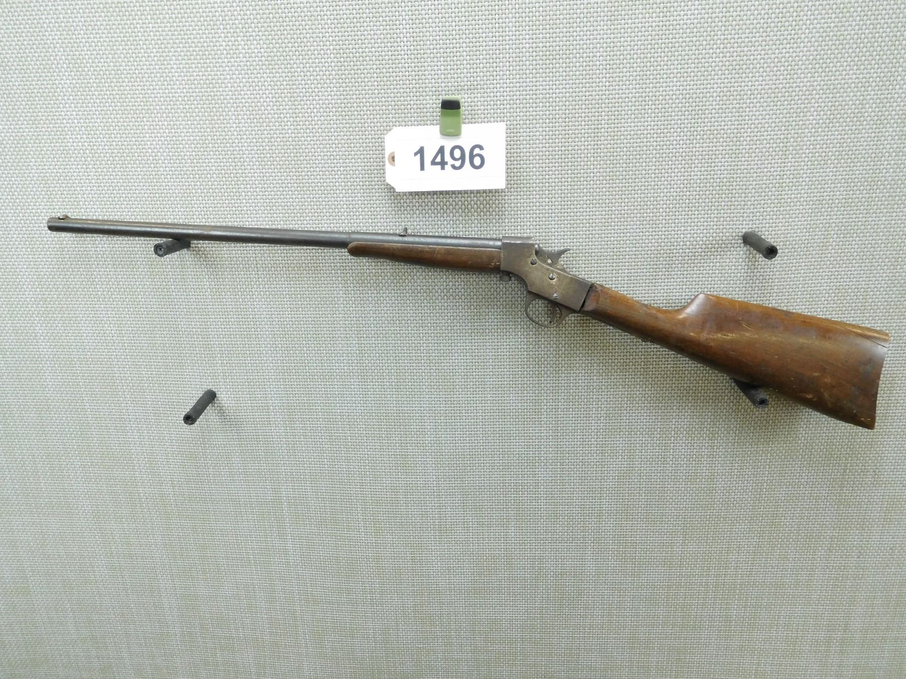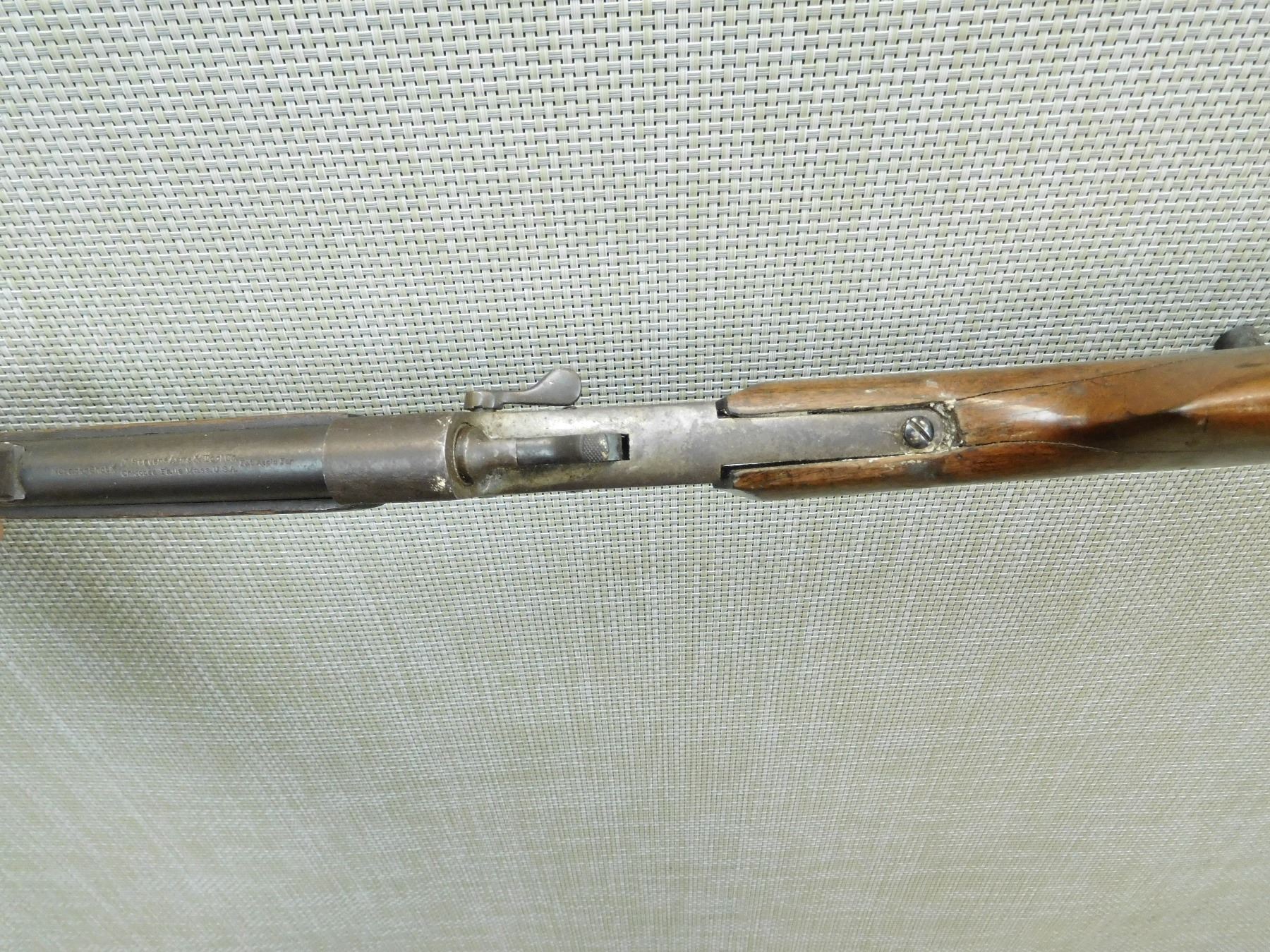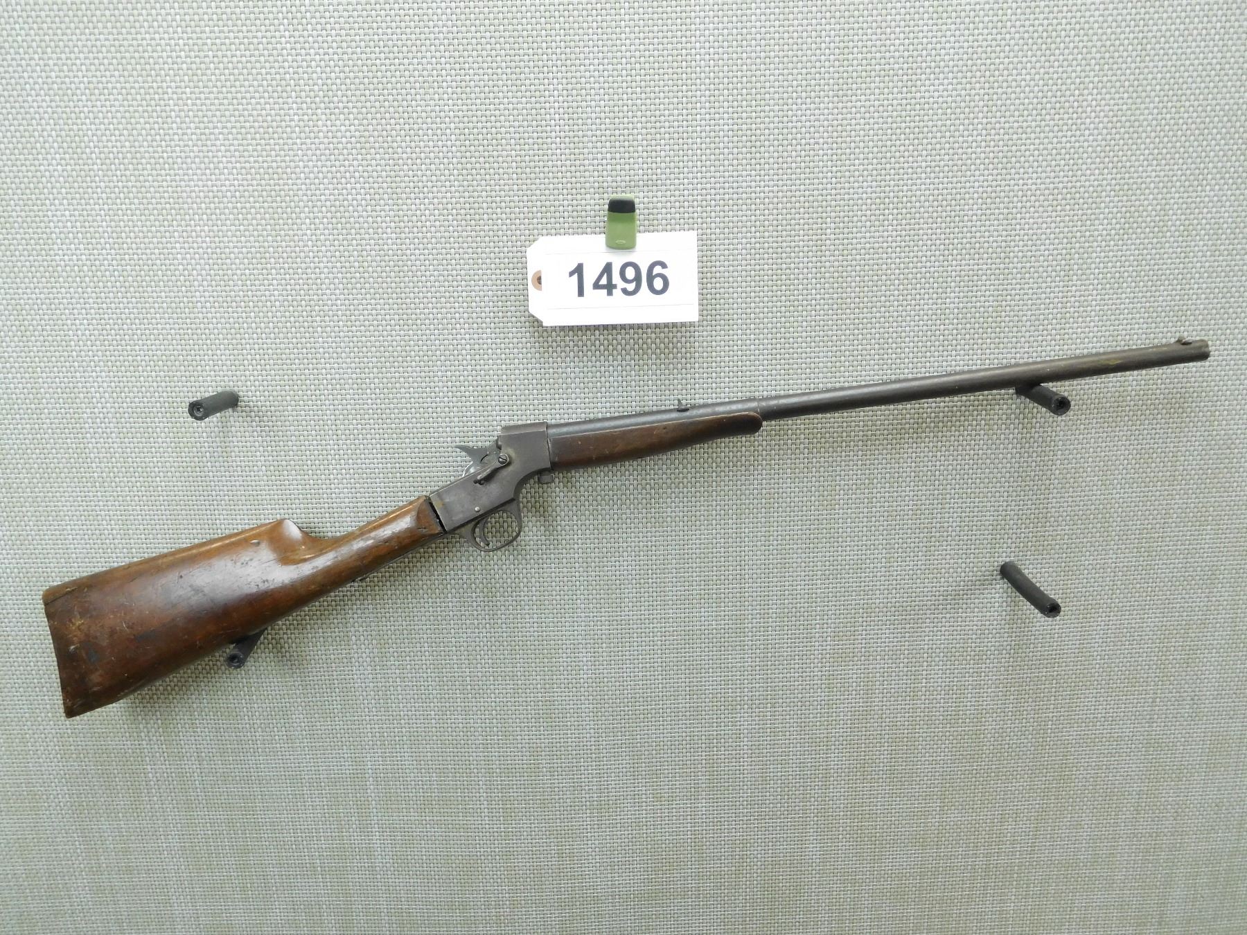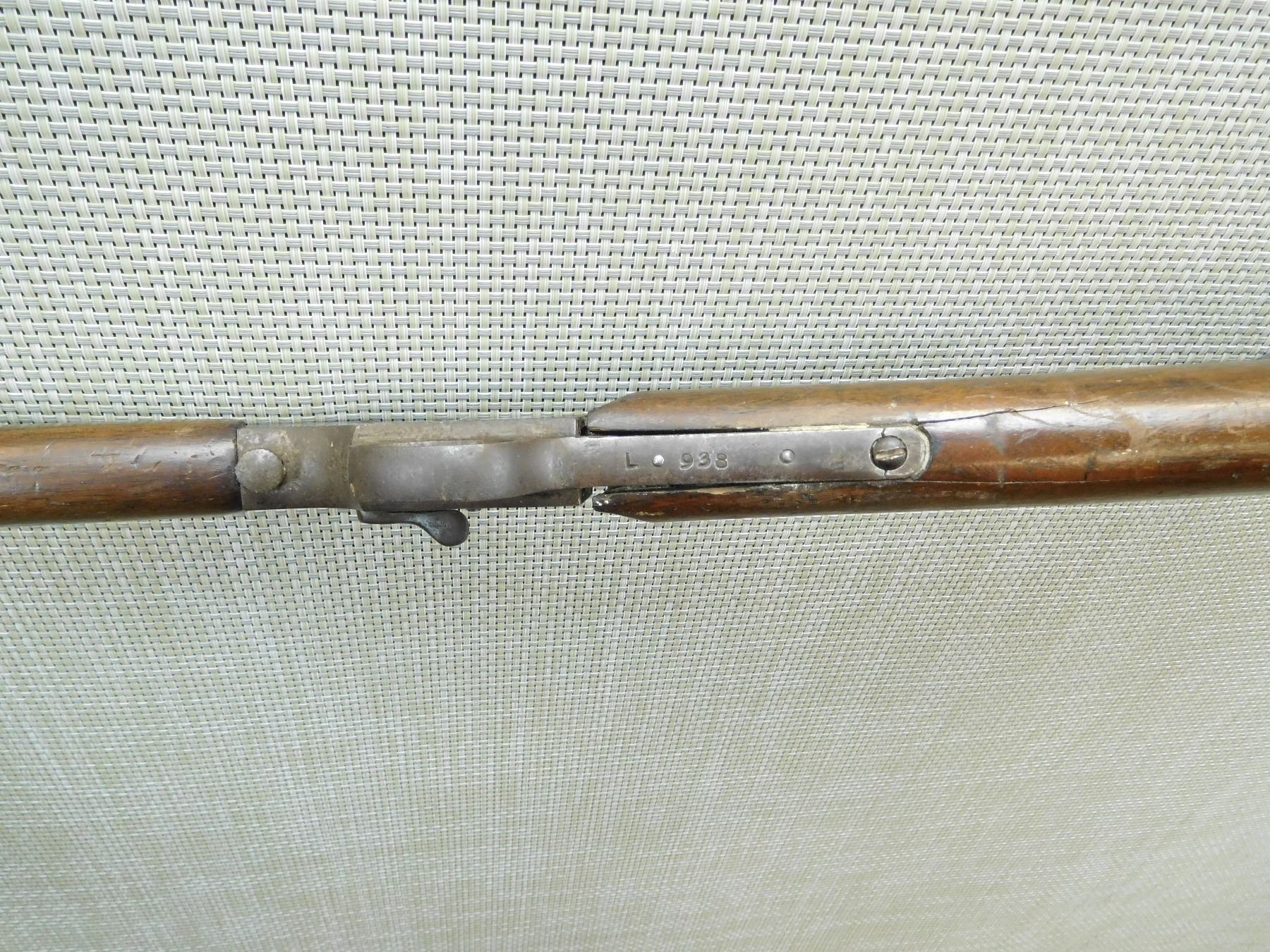 DARK BORE, BLADE FRONT AND FIXED REAR SIGHTS, BUTT STOCK APPEARS TO BE REPLACED IT IS CRACKED AND CHIPPED AND DOES NOT FIT PROPERLY, FALLING BLOCK ACTION IS LOOSE, SHOWS EXTENSIVE HANDLING MARKS , SERIAL # L938 , ACTION: FALLING BLOCK ACTION , BARREL LENGTH: 20" , CONDITION: 3/10 , STOCK # 7852 , CLASS: CANADIAN NON RESTRICTED CLASS
