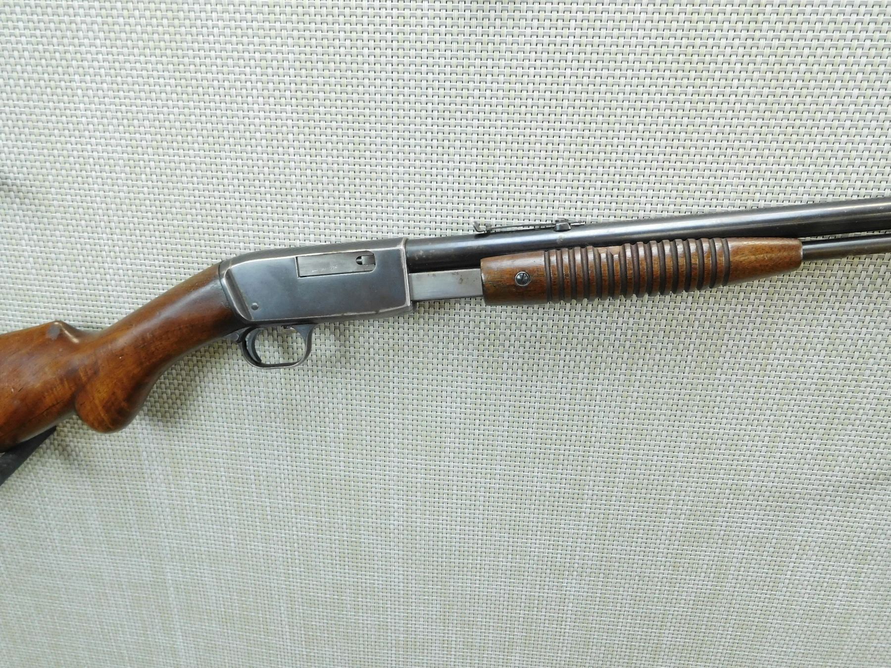 GOOD BORE, BLADE FRONT AND ADJUSTABLE REAR SIGHT, STEEL BUTT PLATE, SHOWS SOME HANDLING MARKS , SERIAL # 33671 , ACTION: PUMP ACTION RIFLE , BARREL LENGTH: 22" , CONDITION: 7/10 , STOCK # 7860 , CLASS: CANADIAN NON RESTRICTED CLASS