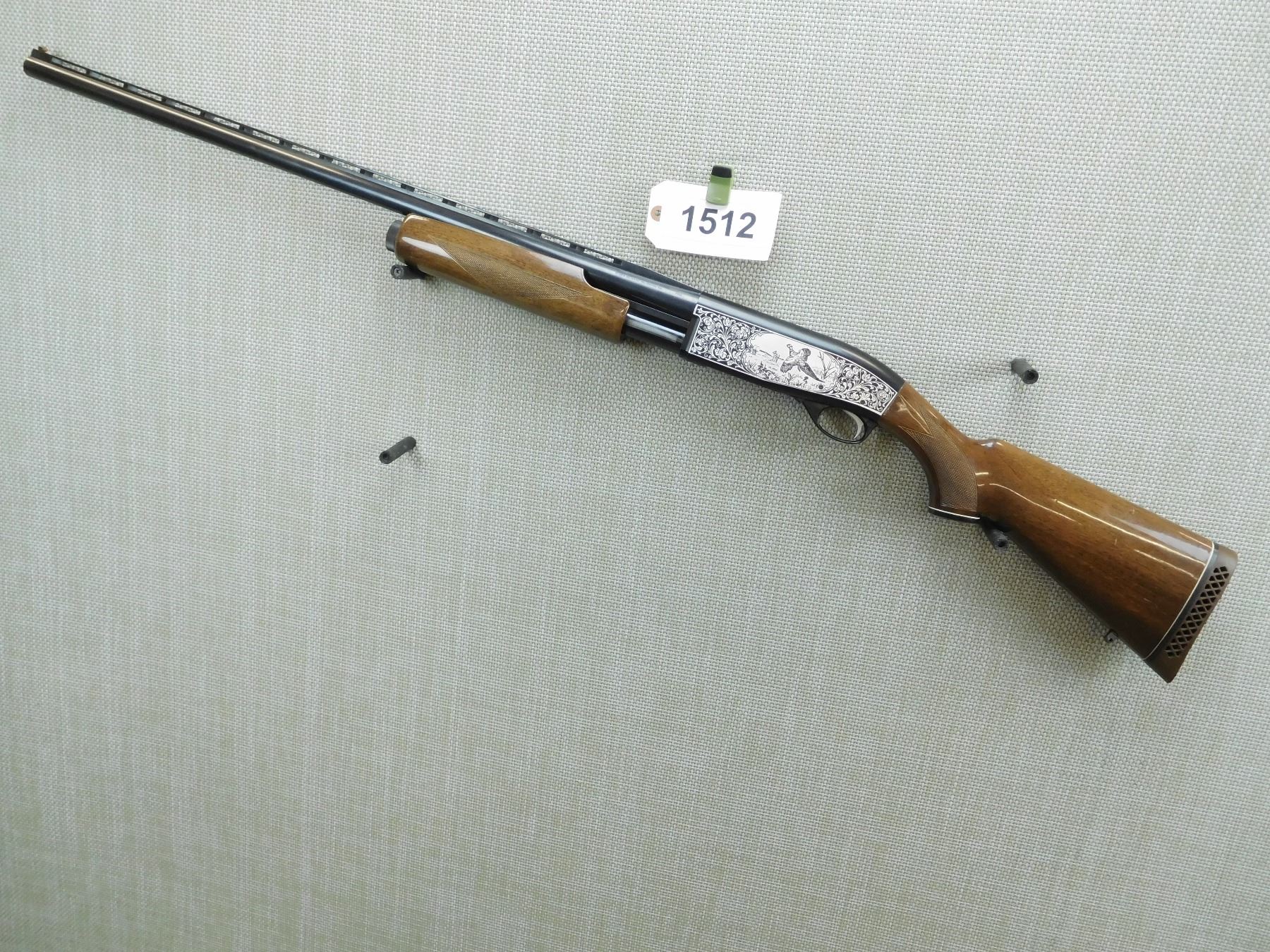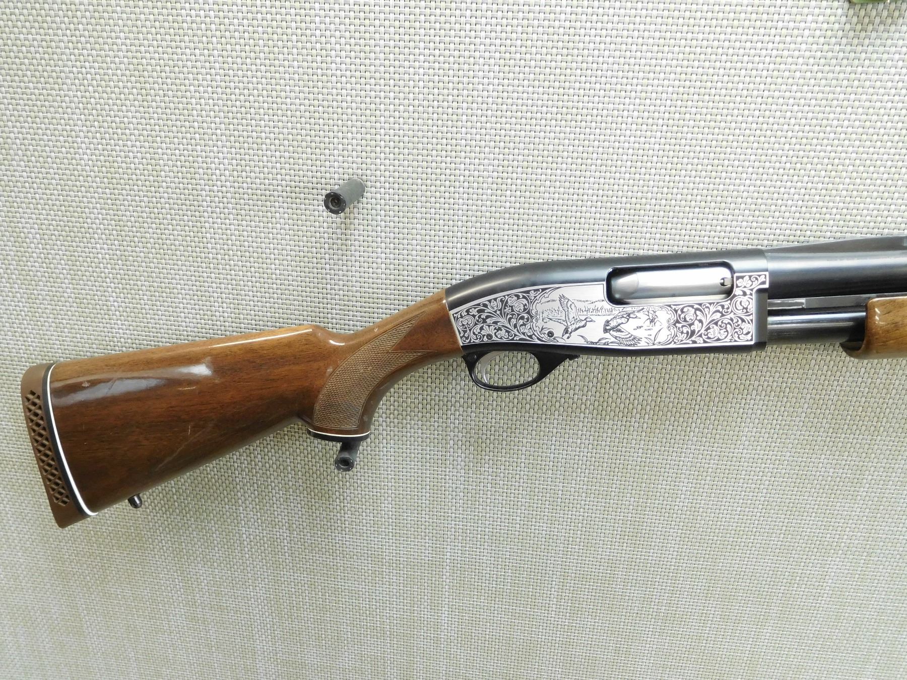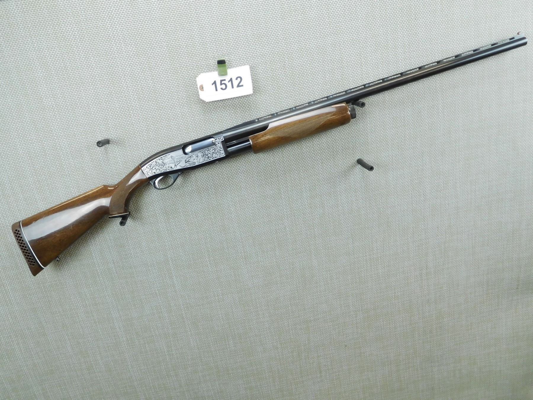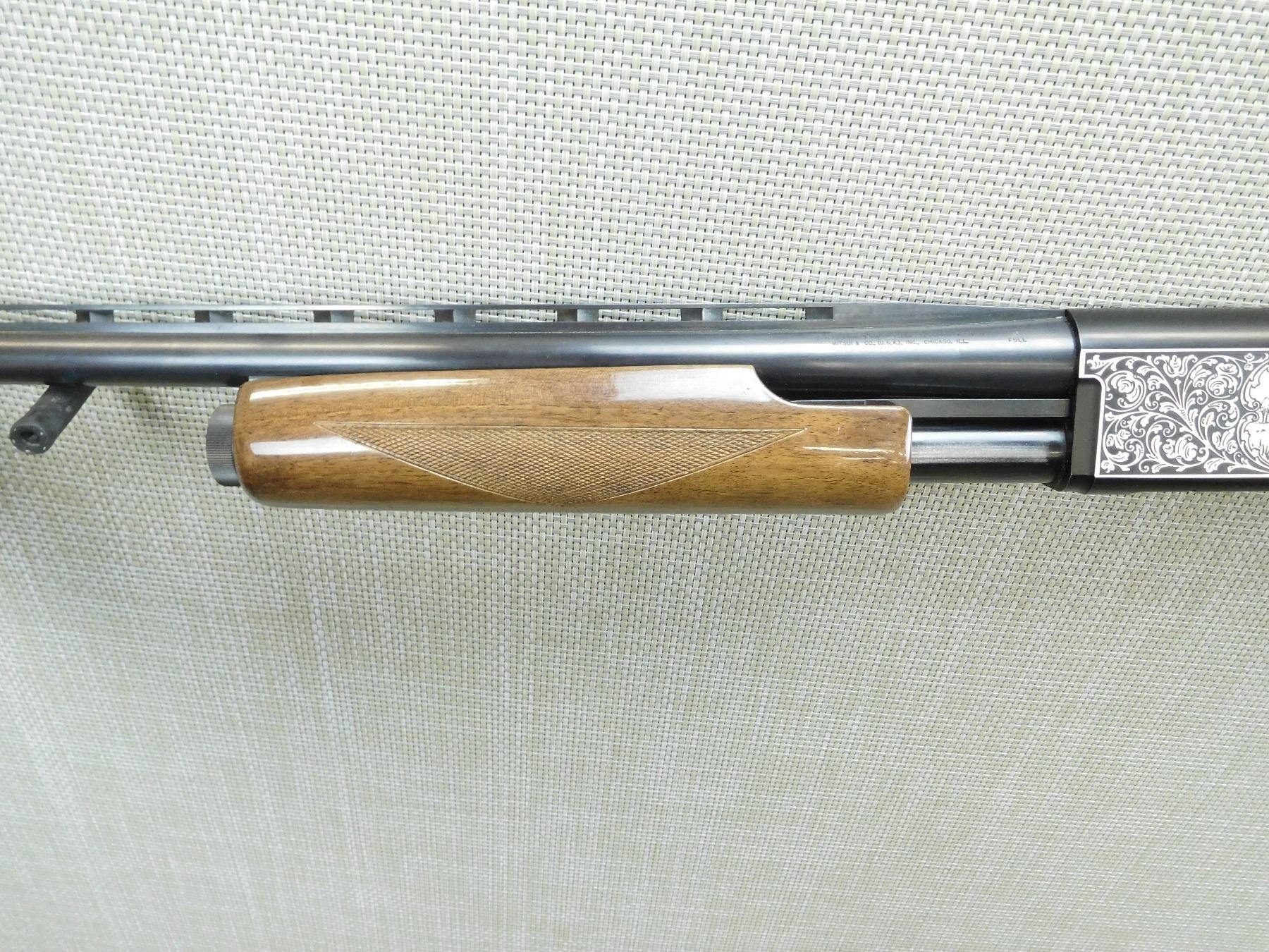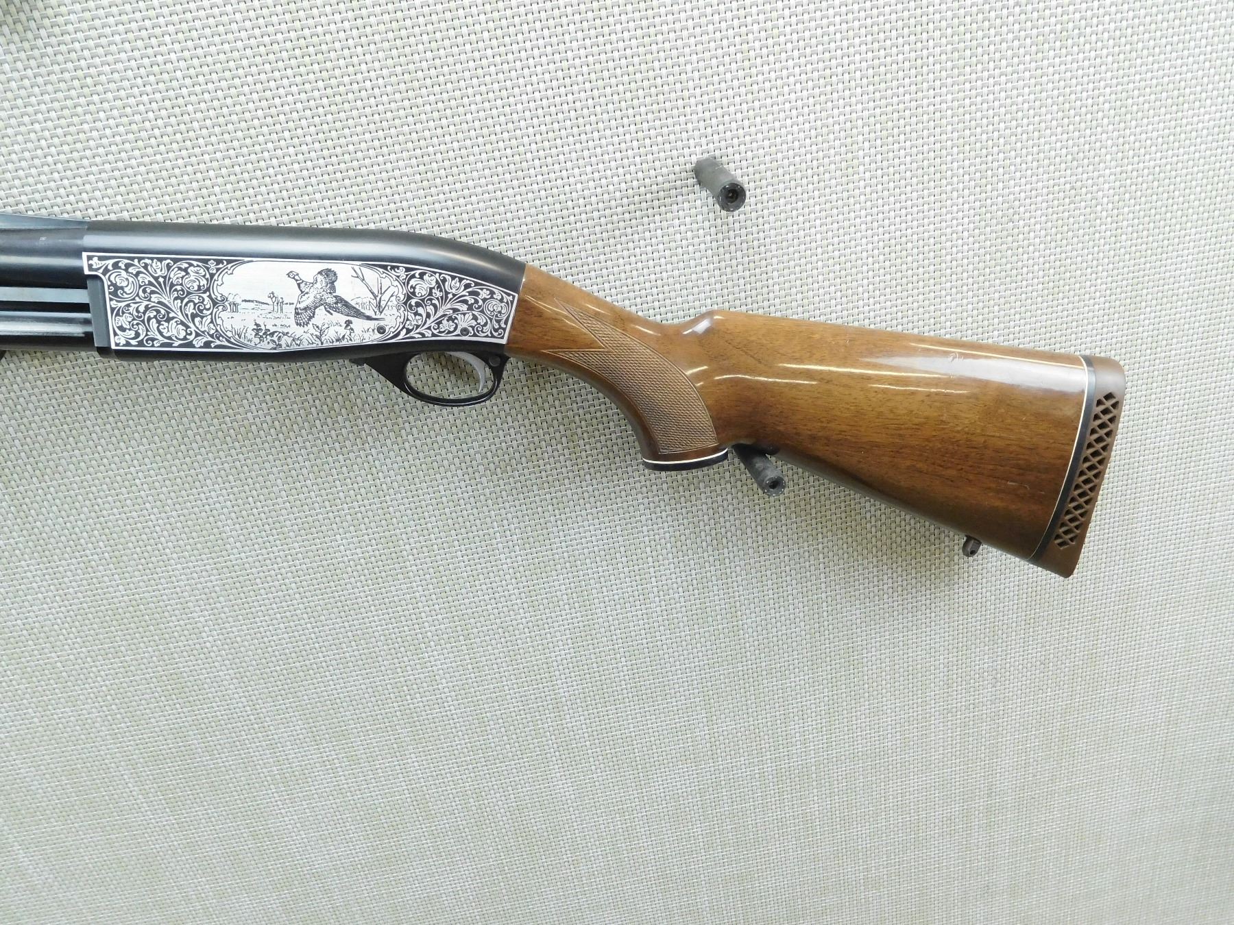FIXED FULL CHOKE, FIBEROPTIC FRONT BEAD SIGHT ON A VENTED RIB BARREL, ENGRAVED GAME SCENE ON RECEIVER FRAME, CHECKERED FORENED AND CAPPED PISTOL GRIP BUTT STOCK WITH A VENTED RUBBER RECOIL PAD, REAR SLING SWIVEL STUD, BUT NO FRONT STUD, BORE IS VERY GOOD, SHOWS SOME HANDLING MARKS , SERIAL # S9002069 , ACTION: PUMP ACTION SHOTGUN , BARREL LENGTH: 30" , CONDITION: 9/10 , STOCK # 7868 , CLASS: CANADIAN NON RESTRICTED CLASS
