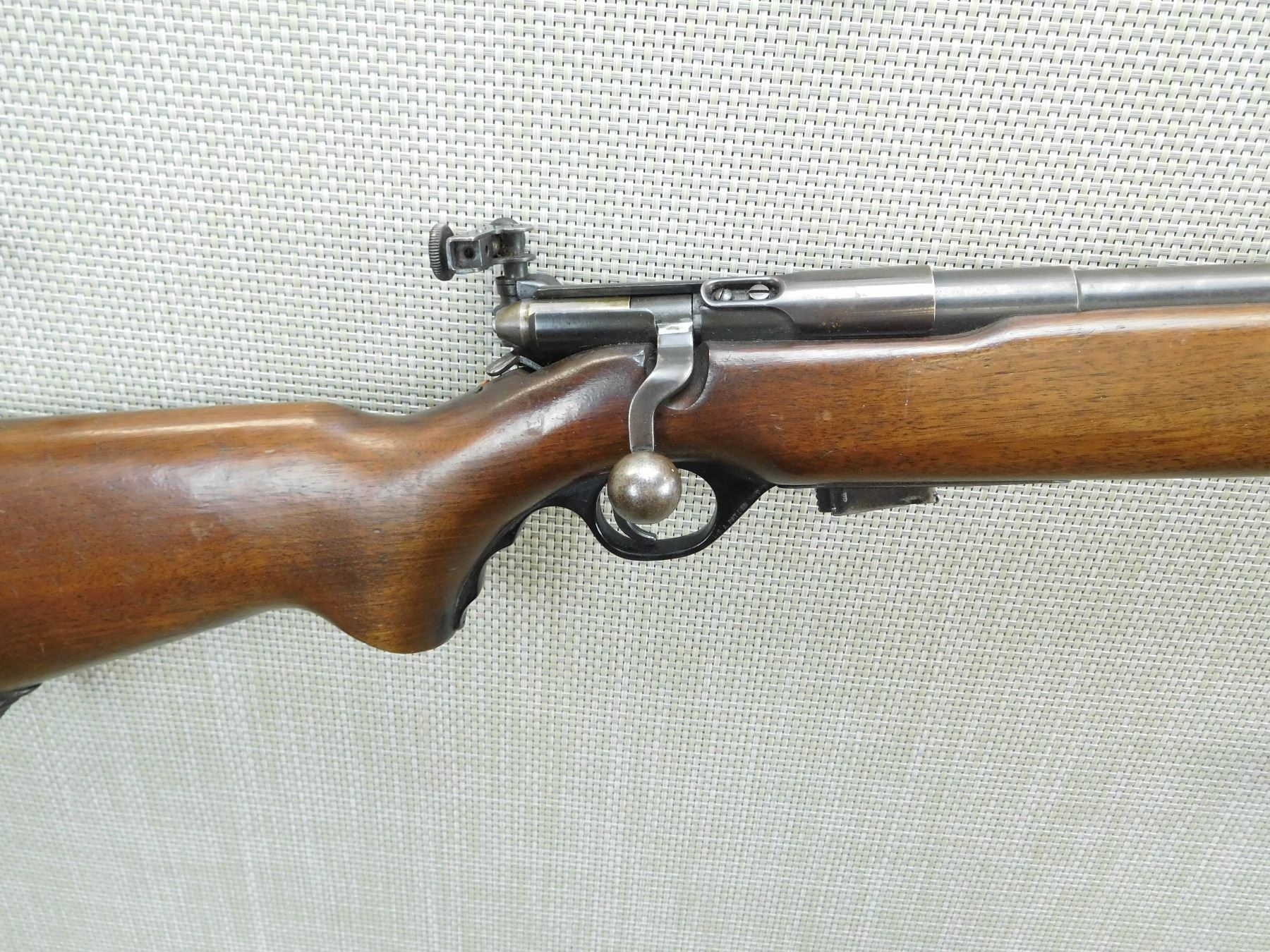 COMES WITH MAGAZINE, VERY GOOD BORE, HOODED FRONT AND FULLY ADJUSTABLE REAR PEEP SIGHT, MISSING THE GREEN SAFETY INDICATOR DOT, SLING SWIVEL LOOPS, STEEL BUTT PLATE, SHOWS SOME HANDLING MARKS , SERIAL # N/A , ACTION: BOLT ACTION RIFLE , BARREL LENGTH: 26" , CONDITION: 6/10 , STOCK # 7873 , CLASS: CANADIAN NON RESTRICTED CLASS