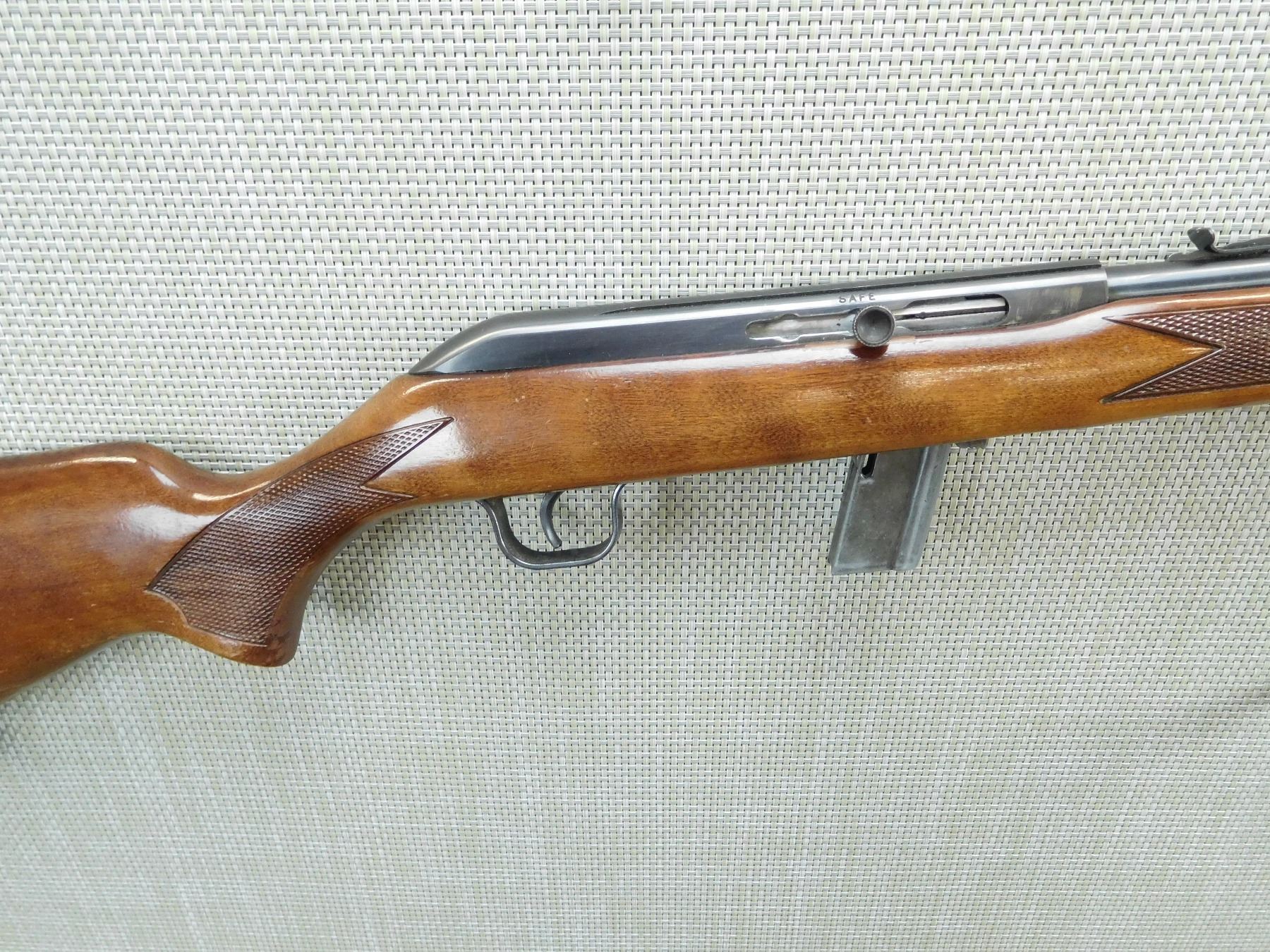 COMES WITH MAGAZINE, VERY GOOD BORE, CHECKERED FOREND AND SEMI PISTOL GRIP BUTT STOCK WITH PLASTIC BUTT PLATE AND WHITE LINE SPACER, DOVE TAIL FRONT AND ADJUSTABLE REAR SIGHTS, SHOWS SOME HANDLING MARKS , SERIAL # CA58584 , ACTION: SEMI AUTOMATIC RIFLE , BARREL LENGTH: 20" , CONDITION: 7/10 , STOCK # 7874 , CLASS: CANADIAN NON RESTRICTED CLASS