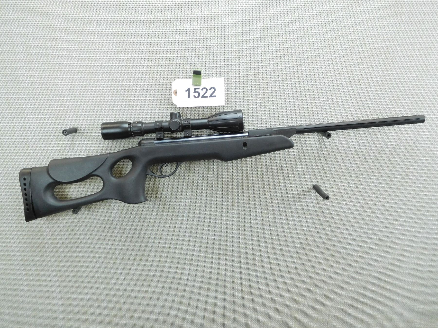 HAS A GAMO 3 - 9 39 x 40 SCOPE, 525 FPS, VERY GOOD BORE, FLUTED BARREL, BLACK SYNTHETIC THUMBWHOLE STOCK WITH RUBBER BUTT PAD, DRILLED RECEIVER FOR ALTERNATIVE SIGHT NOT INCLUDED, SHOWS SOME HANDLING MARKS , SERIAL # N/A , ACTION: BREAK BARREL AIR RIFLE , BARREL LENGTH: 16" , CONDITION: 6/10 , STOCK # 7878 , CLASS: CANADIAN NON RESTRICTED CLASS
