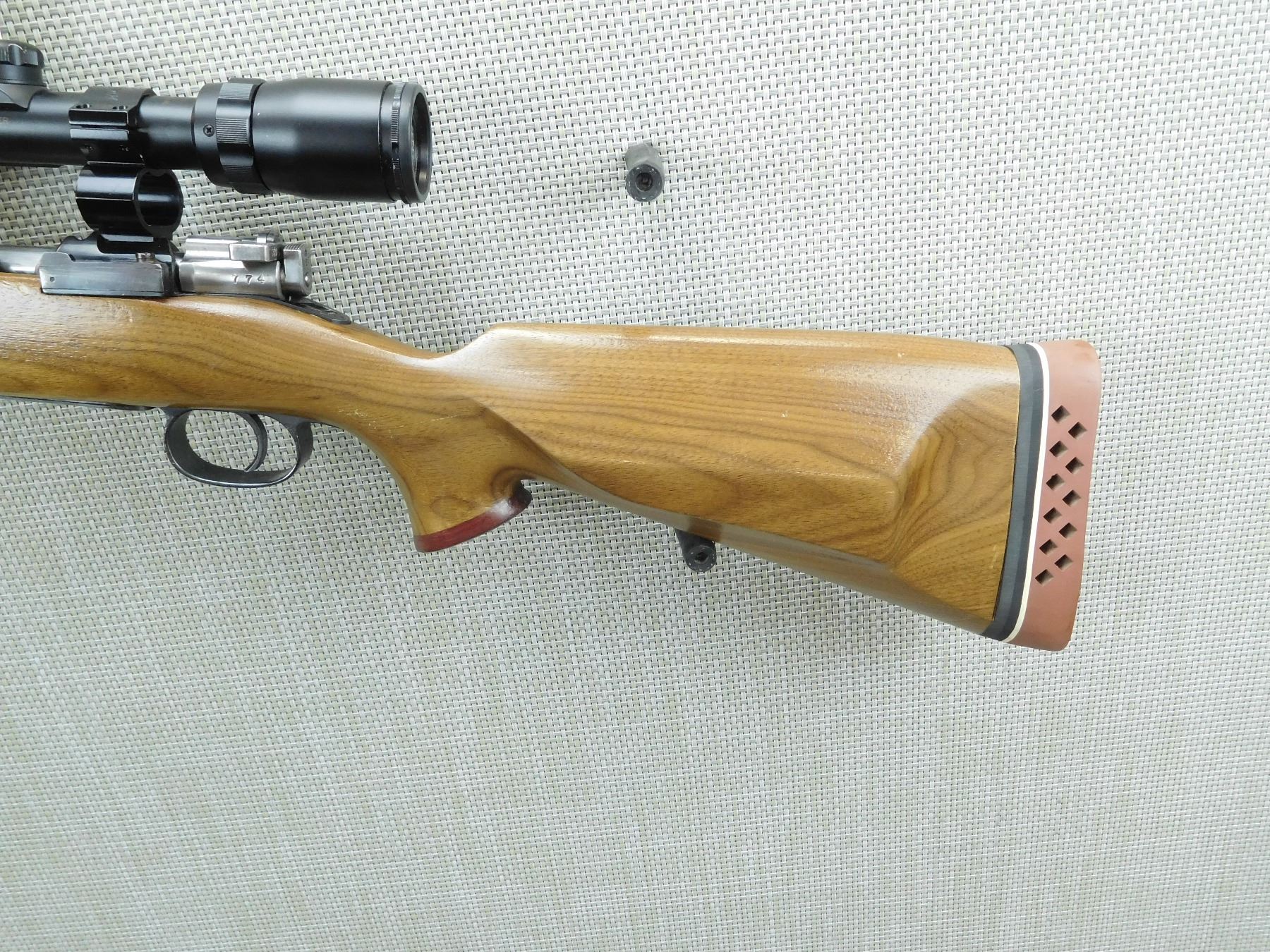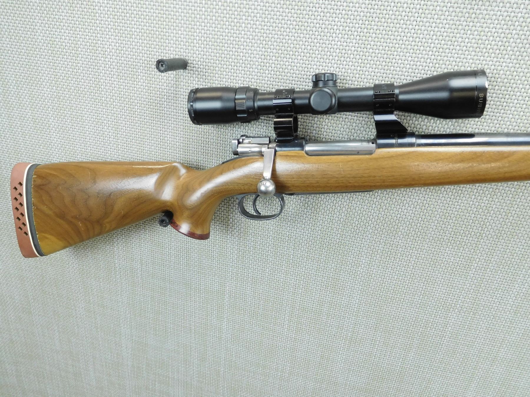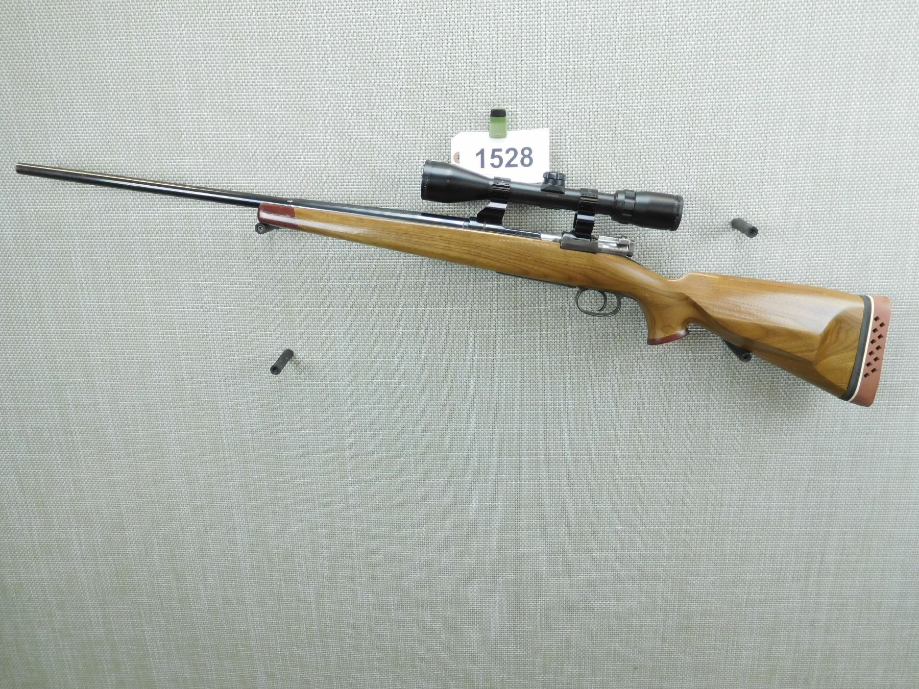 CUSTOM MODEL, BUSHNELL BANNER 3-9 X 40 SCOPE ON SEE THROUGH SCOPE RINGS, ROSEWOOD CAPPED FOREND AND PISTOL GRIP WITH A RAISED CHEEK PIECE ON THE BUTT STOCK AND A VENTED RUBBER RECOIL PAD, GOOD BORE, NO SIGHTS, HINGED FLOOR PLATE, BOLT AND RECEIVER MATCH BY SERIAL #, SHOWS SOME HANDLING MARKS , SERIAL # 628774 , ACTION: BOLT ACTION RIFLE , BARREL LENGTH: 24" , CONDITION: 7/10 , STOCK # 7884 , CLASS: CANADIAN NON RESTRICTED CLASS