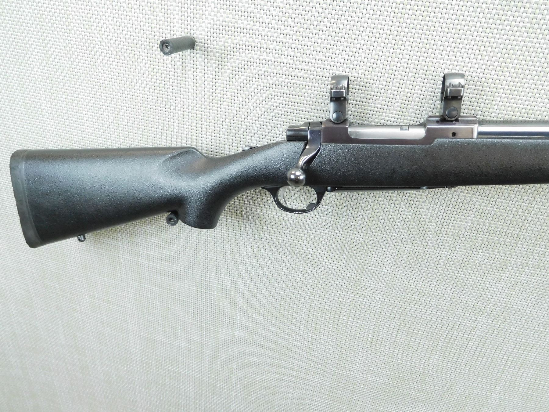 HINGED FLOOR PLATE, BLACK TEXTURED STOCK WITH FULL PISTOL GRIP AND RUBBER RECOIL PAD, BULL BARREL WITH EXCELLENT RIFLING, HIGH 1" RUGER RINGS AND SCOPE MOUNTS, SLING SWIVEL STUDS, SHOWS SOME HANDLING MARKS , SERIAL # 77194978 , ACTION: BOLT ACTION RIFLE , BARREL LENGTH: 24" , CONDITION: 7/10 , STOCK # 7888 , CLASS: CANADIAN NON RESTRICTED CLASS