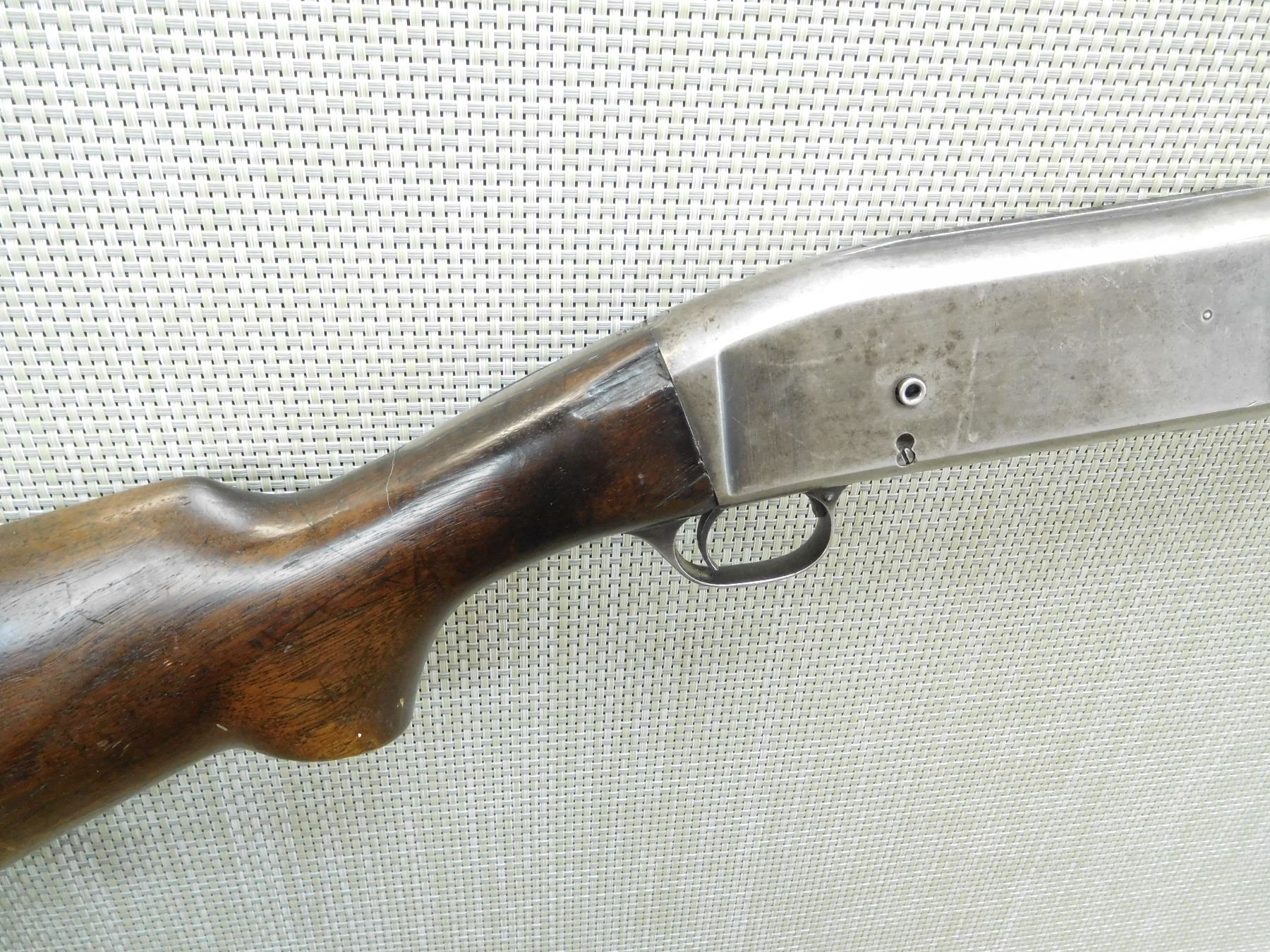 BORE IS GOOD, BEAD FRONT SIGHT, SHOWS EXTENSIVE HANDLING MARKS, CRACKED AND CHIPPED BUTT PLATEAS WELL AS THE BUTT STOCK , , SERIAL # 248496 , ACTION: PUMP ACTION SHOTGUN , BARREL LENGTH: 30" , CONDITION: 4/10 , STOCK # 7907 , CLASS: CANADIAN NON RESTRICTED CLASS