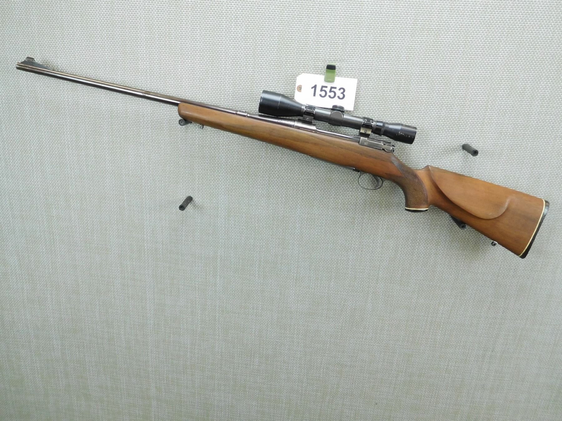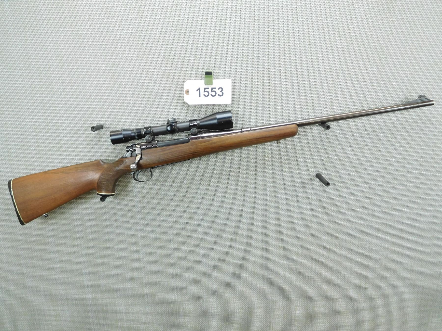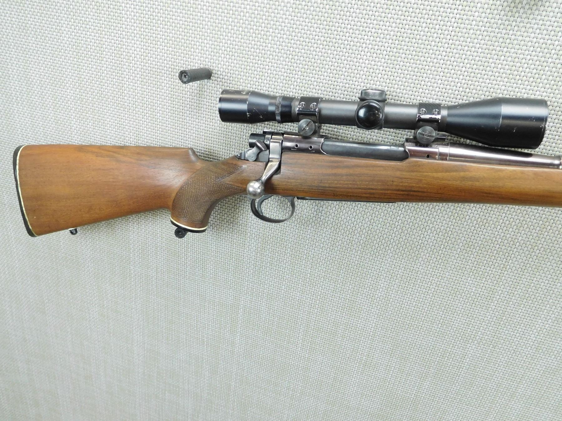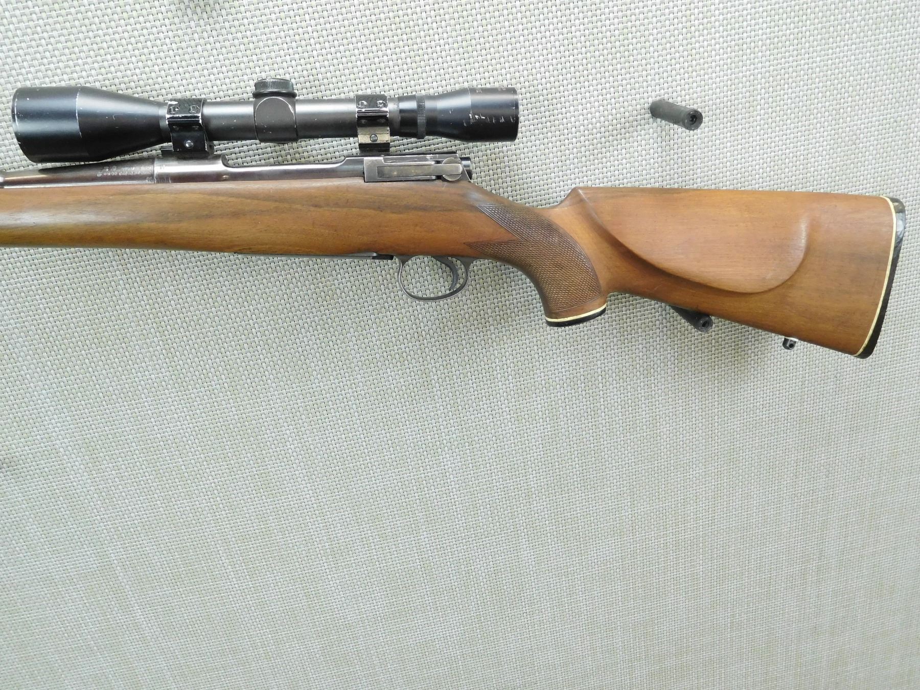 GOOD BORE, HAS A NIKKO STIRLING SCOPE, RECEIVER IS ALSO DRILLED AND TAPPED FOR SIDE SCOPE MOUNTS, RAMP FRONT AND MISSING REAR SIGHT, CHECKERED CAPPED PISTOL GRIP BUTT STOCK PLASTIC BUTT PLATE WITH WHITE LINE SPACER, SLING SWIVEL STUDS, SHOWS SOME HANDLING MARKS , SERIAL # HA171224 , ACTION: BOLT ACTION RIFLE , BARREL LENGTH: 24" , CONDITION: 6/10 , STOCK # 7909 , CLASS: CANADIAN NON RESTRICTED CLASS