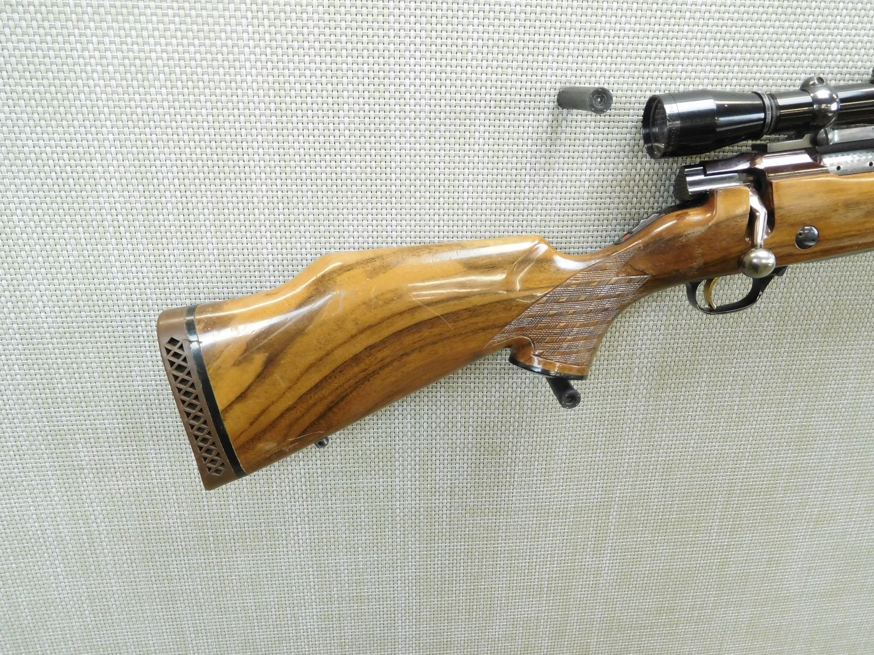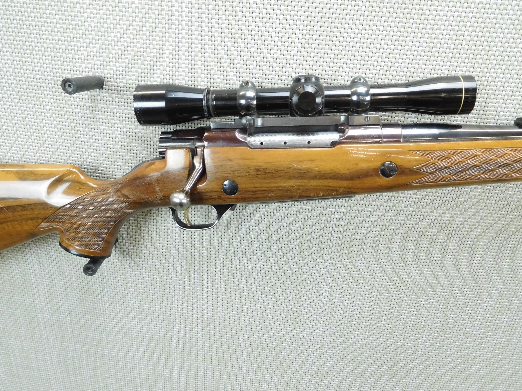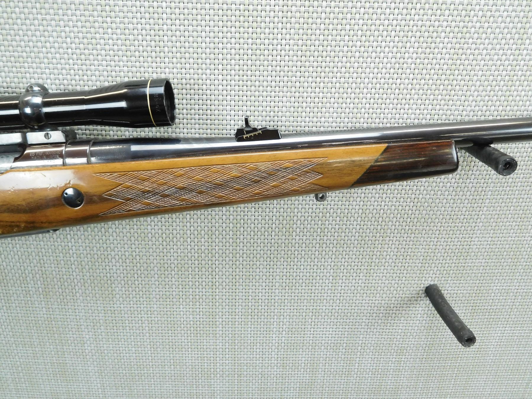 DARK BORE, RAMP FRONT AND ADJUSTABLE REAR SIGHT, HAS A LEUPOLD M8-4X SCOPE, CROSS HATCHED CHECKERED FOREND AND FULL PISTOL GRIP BUTT STOCK, VENTED RUBBER RECOIL PAD, JEWLED BOLT, SHOWS SOME HANDLING MARKS, SLING SWIVEL STUDS , SERIAL # 15897 , ACTION: BOLT ACTION RIFLE , BARREL LENGTH: 25" , CONDITION: 6/10 , STOCK # 7910 , CLASS: CANADIAN NON RESTRICTED CLASS