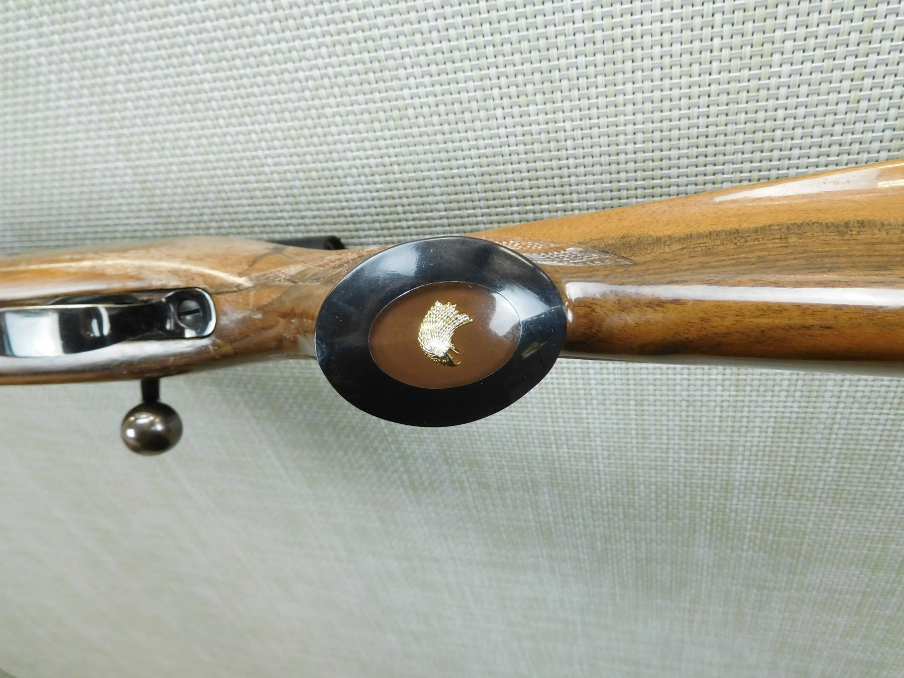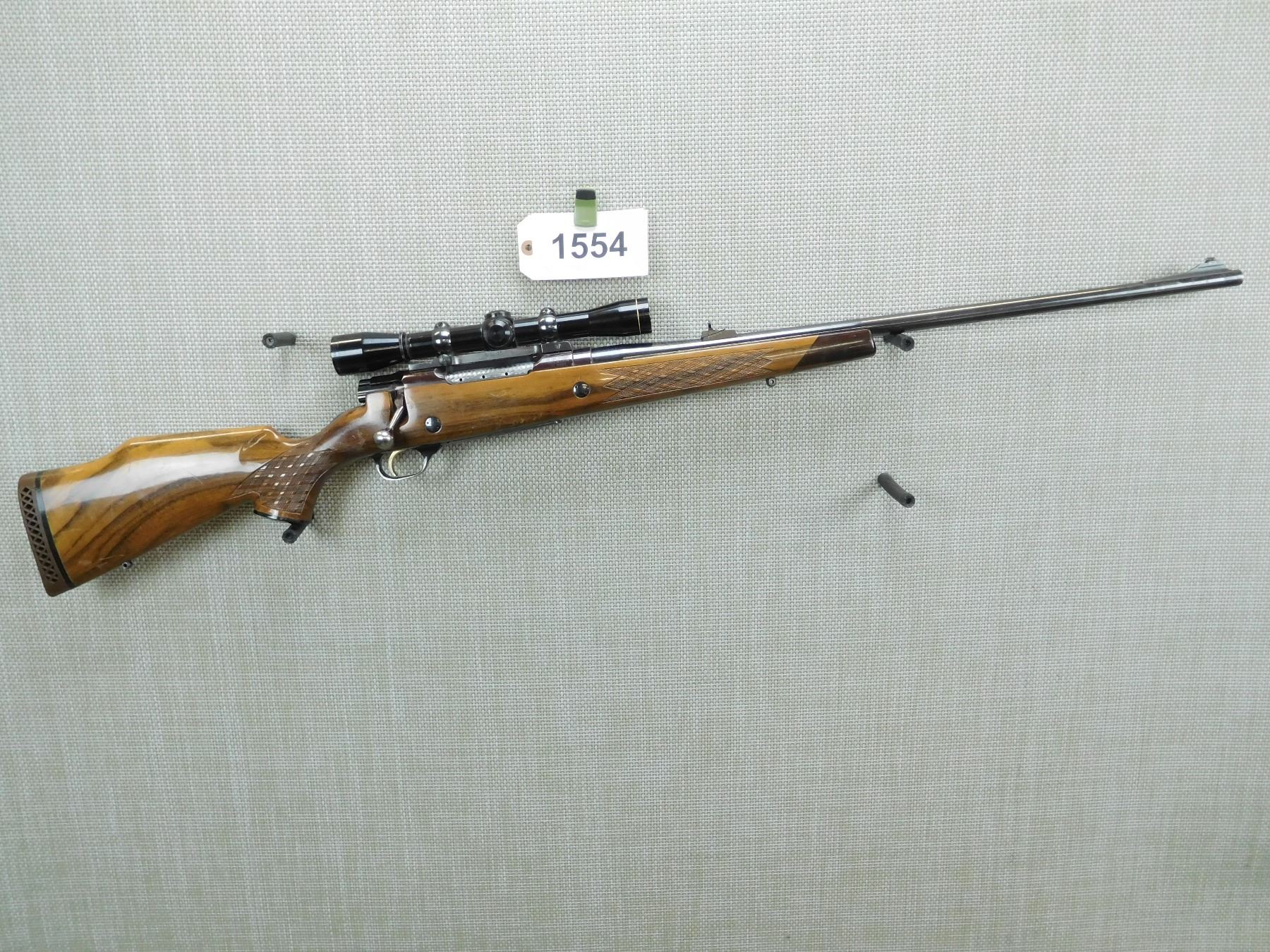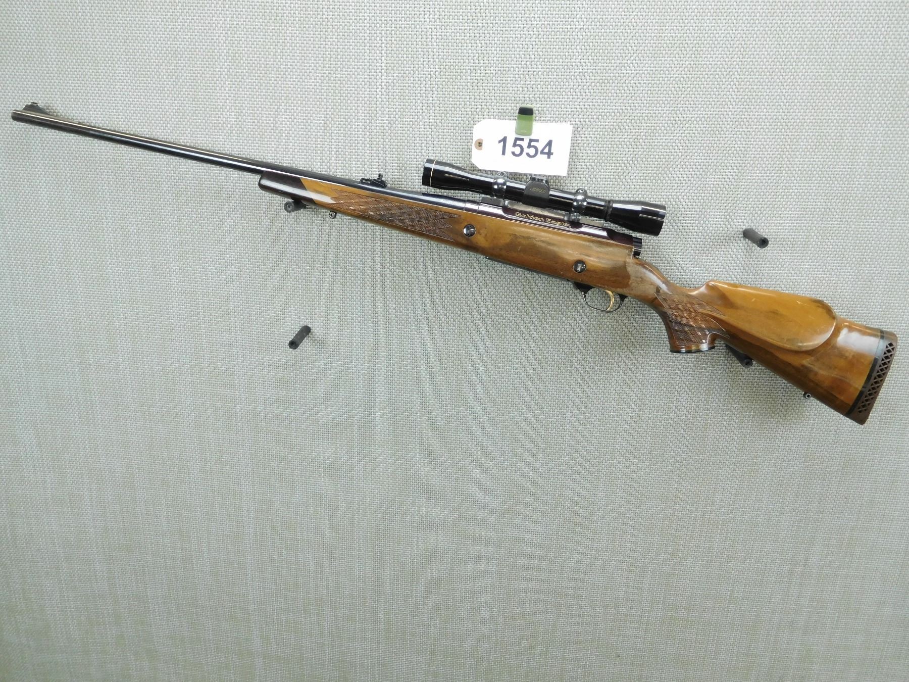 DARK BORE, RAMP FRONT AND ADJUSTABLE REAR SIGHT, HAS A LEUPOLD M8-4X SCOPE, CROSS HATCHED CHECKERED FOREND AND FULL PISTOL GRIP BUTT STOCK, VENTED RUBBER RECOIL PAD, JEWLED BOLT, SHOWS SOME HANDLING MARKS, SLING SWIVEL STUDS , SERIAL # 15897 , ACTION: BOLT ACTION RIFLE , BARREL LENGTH: 25" , CONDITION: 6/10 , STOCK # 7910 , CLASS: CANADIAN NON RESTRICTED CLASS