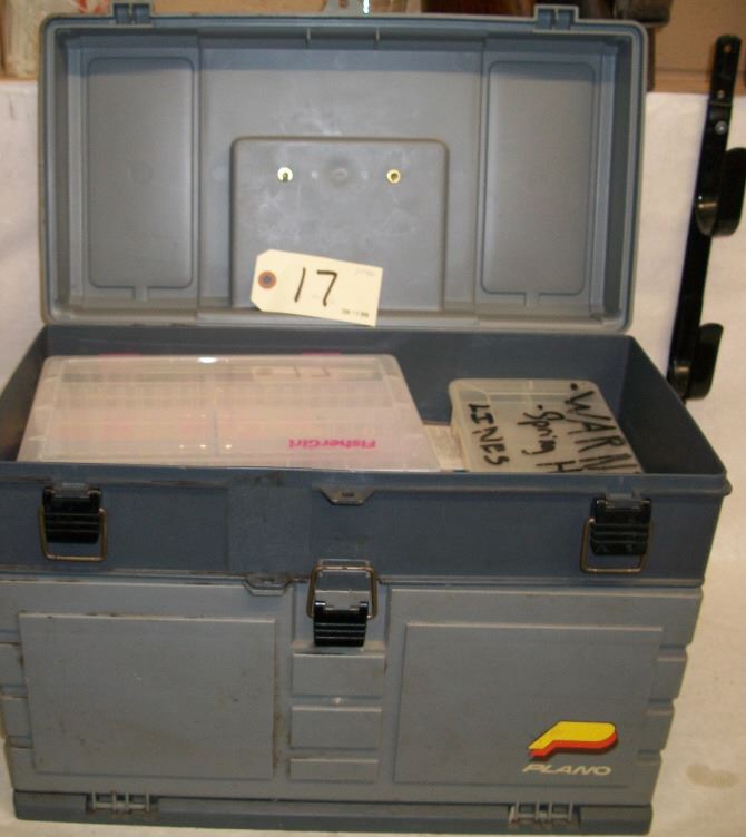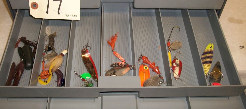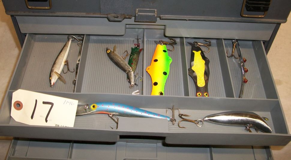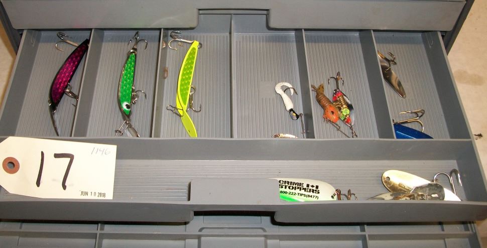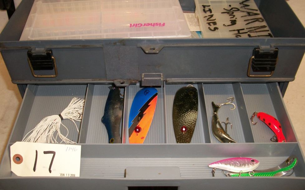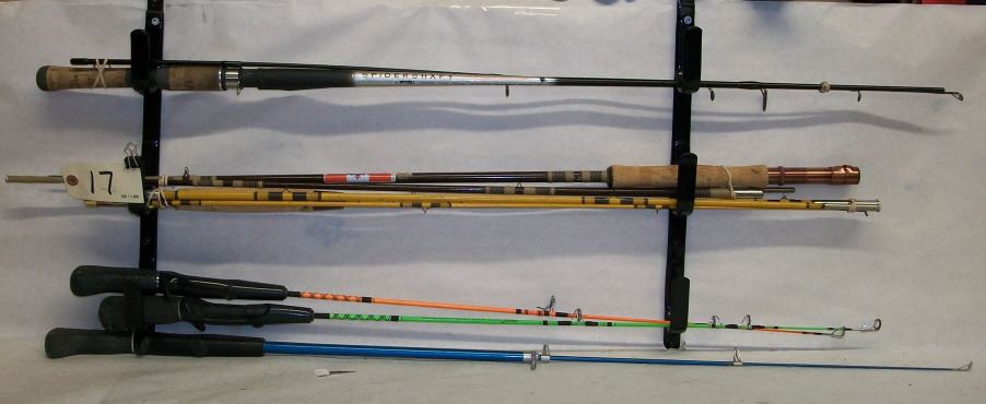 6 POLES, 1 - MITCHELL SPIDER SHAFT, 2 - RENEGADE SPIN CAST RODS, 1 - TELESCOPIC ROD THAT WON'T GO IN ALL THE WAY, 1 - PLAYMAKER AND 1 UNKOWN FLY ROD, 3 REELS, 1 - ZEBCO ADVENTURE, 1 - SOUTH BEND CONDOR 530, 1 - ABU GARCIA MX110R, PLANO 1 TRAY 4 DRAWER TACKLE BOX WITH TACKLE, SOME BIG SPOONS AND OTHER LURES
