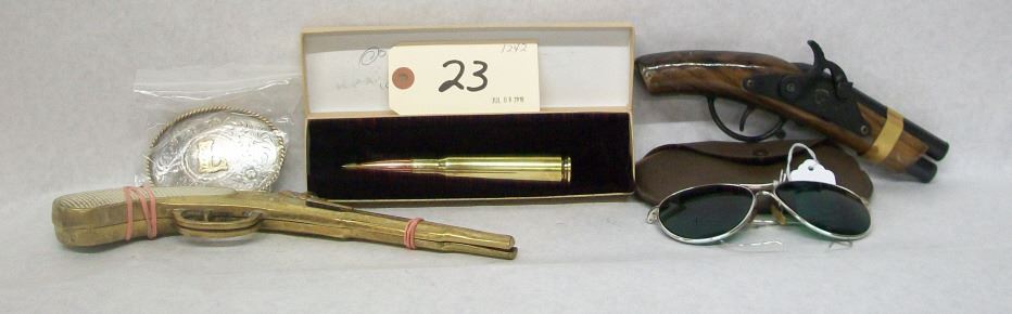 2 PISTOL HALVES FOR DECORATION MADE OF BRASS, NON FIRING REPLICA PISTOL, GREEN AVIATOR GLASSES, MONTANA SILVERSMITHS BELT BUCKLE (SILVER PLATED), .50 BMG CATRIDGE MADE INTO A PEN IN THE BOX.