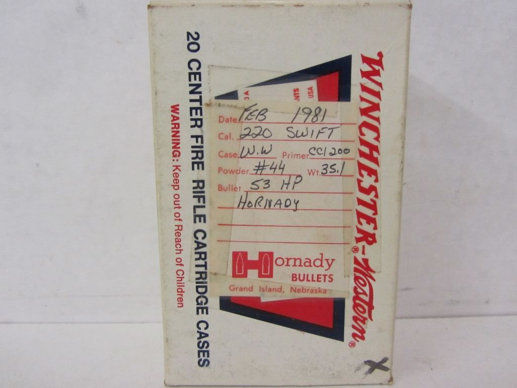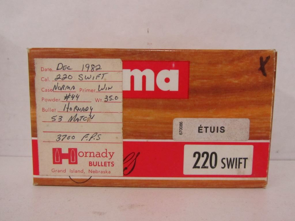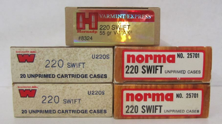 ONE BOX OF HORNADY VARMINT EXPRESS 220 SWIFT 55GR V-MAX, TWO BOXES OF WINCHESTER WESTERN 220 SWIFT, TWO BOXES OF NORMA NO. 25701 220 SWIFT.