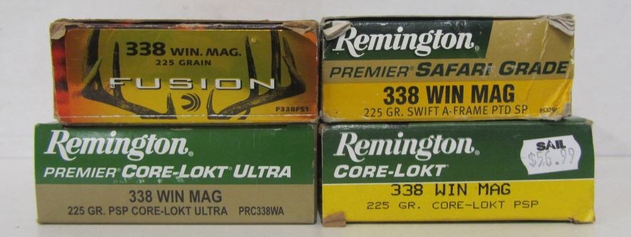 ONE BOX OF FUSION 338 WIN MAG 225GR, ONE BOX OF REMINGTON PREMIER CORE-LOKT ULTRA 338 WIN MAG 225GR, ONE BOX OF REMINGTON PREMIER SAFARI GRADE 338 WIN MAG 225GR, ONE BOX OF REMINGTON CORE-LOKT 338 WIN MAG 225GR CORE-LOKT.