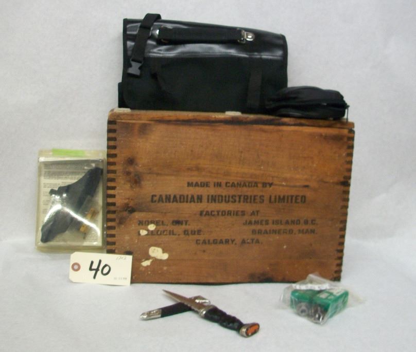 MAG LOADER, SCOPE MOUNT FOR COLT .45 ACP, PLASTIC GRIPS COLT SAA, HARRIS BIPOD BARREL ADPTER, PAST SHOOTING GLOVE, SCOTTISH SKEAN-DHU KNIFE MADE IN ENGLAND, 2 NYLON BAGS, RCBS BULLET SEATS #6, #3, #2, #11 AND #7, BROWNING BPS SCOPE MOUNT.