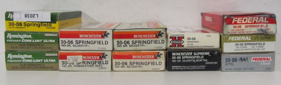 TWO BOXES OF REMINGTON PREMIER CORE-LOKT ULTRA 30-06 SPRG 180GR, ONE BOX OF REMINGTON HIGH-VELOCITY 30-06SPRG 180GR BRONZE POINT, TWO BOXES OF WINCHESTER SUPER-X 30-06SPRG 220GR SILVERTIP, TWO BOXES OF WINCHESTER SUPER-X 30-06SPRG 180GR SILVERTIP, ONE BOX OF WINCHESTER SUPER-X 30-06SPRG 150GR SILVERTIP, ONE BOX OF WINCHESTER SUPREME 30-06SPRG 180GR SILVERTIP BOATTAIL, ONE BOX OF FEDERAL CLASSIC 30-06SPRG 150GR HI-SHOK SOFT POINT, ONE BOX OF FEDERAL PREMIUM 30-06SPRG 180GR NOSLER PARTITON BULLET, ONE BOX OF FEDERAL 30-06SPRG 220GR ROUND NOSE SOFT POINT.