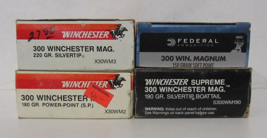 TWO BOXES OF WINCHESTER 300 WIN MAG 180GR POWER-POINT (S.P.), ONE BOX OF WINCHESTER SUPREME 300 WIN MAG 190GR SILVERTIP BOATTAIL, ONE BOX OF FEDERAL 300 WIN MAG 150GR SOFT POINT.