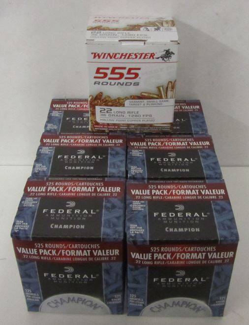SIX BOXES OF FEDERAL CHAMPION 22LR 36GR COPPER PLATED HOLLOW POINT 525 ROUNDS PER BOX, ONE BOX OF WINCHESTER 22LR 36GR COPPER PLATED HOLLOW POINT 555 ROUNDS PER BOX.