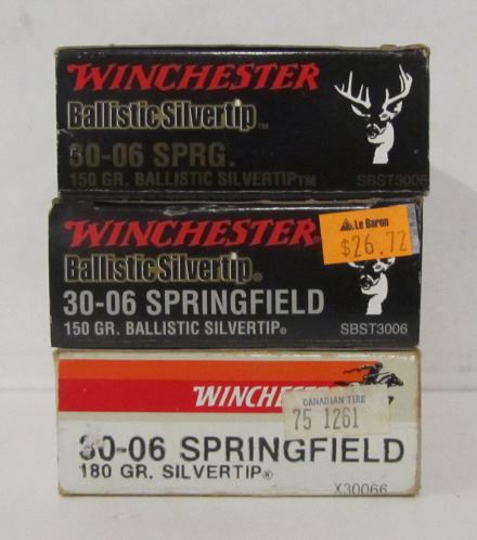 ONE BOX OF WINCHESTER 180GR SILVERTIP 20 ROUND BOX, TWO BOXES OF WINCHESTER 30-06 150GR BALLISTIC SILVERTIP ONE BOX FULL AND ONE BOX HAS 11 LIVE ROUNDS WITH 9 EMPTIES.