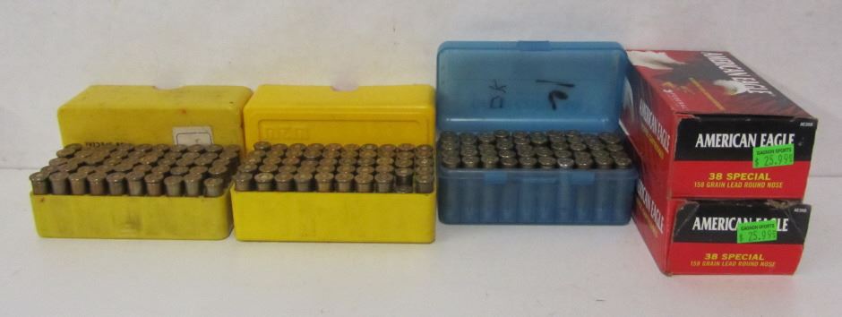 300 ROUNDS OF 38SPL RELOADED ROUNDS AND BOX OF 38SPL NICKLE EMPTIES UNKNOWN AMOUNT.