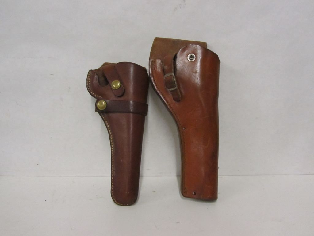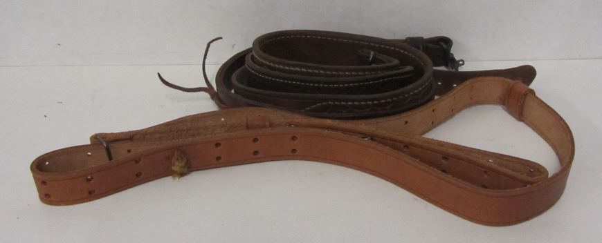 Lot 118 THREE LEATHER GUN STRAPS & TWO PISTOL HOLSTERS