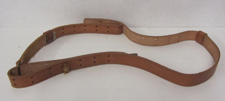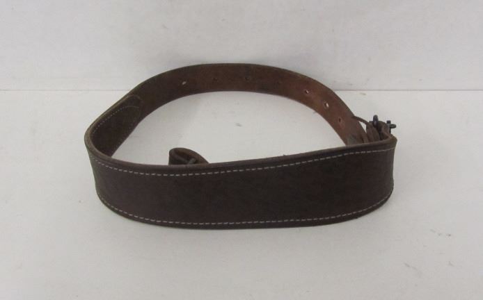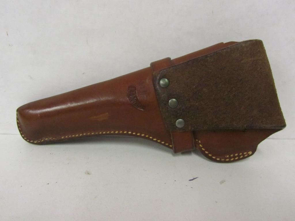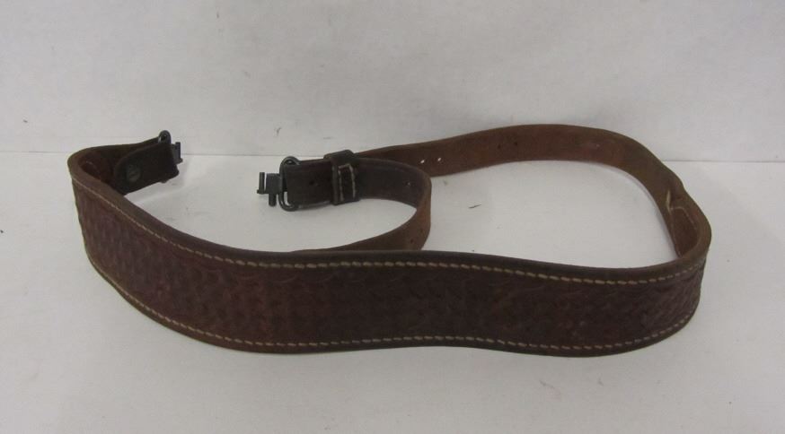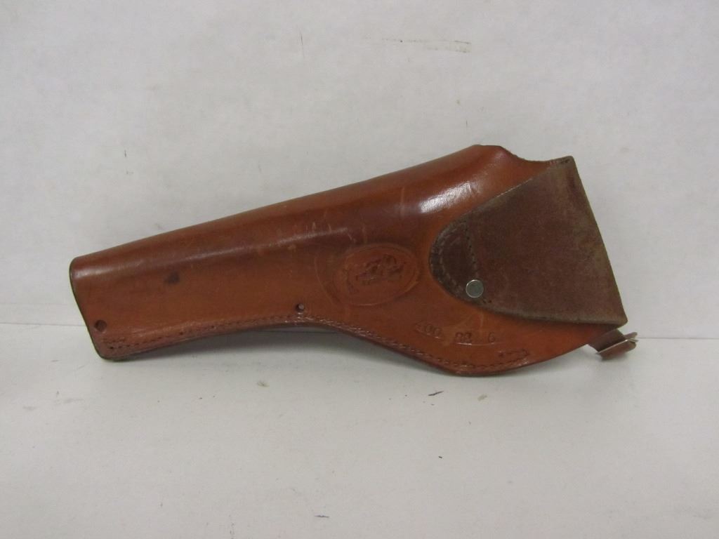 THREE LEATHER GUN STRAPS (TWO WITH SWIVELS, ONE WITHOUT), ONE MODEL 1100 LEATHER PISTOL HOLSTER, ONE LEATHER PISTOL HOLSTER STAMPED 400 82 6.