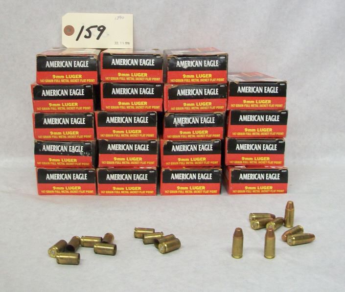 958 ROUNDS 9MM 147 GR FLAT POINT FMJ AMERICAN EAGLE AMMO, ALL FACTORY LOADS WITH 10 EMPTY BRASS CASES.