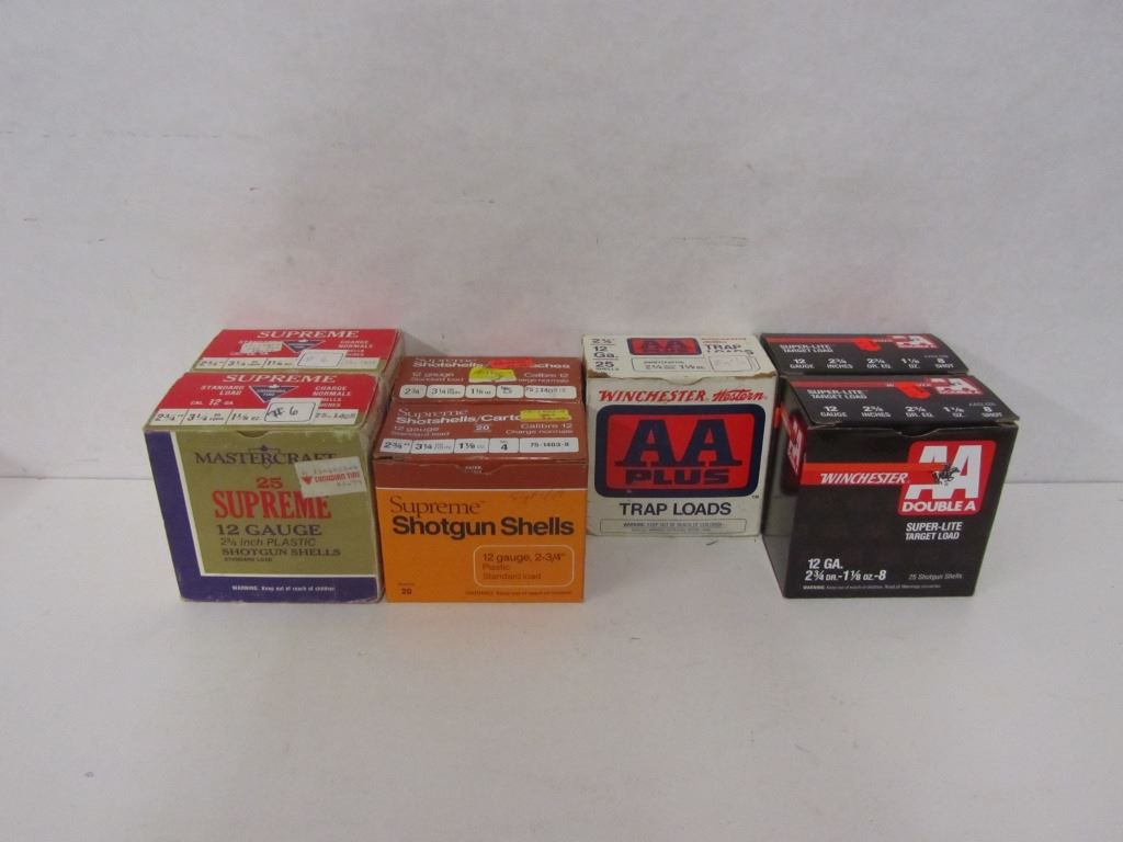 TWO BOXES OF CANADIAN TIRE MASTERCRAFT SUPREME 12GA 2 3/4" #6, ONE BOX OF CANADIAN TIRE SUPREME 12GA 2 3/4" #5, ONE PART BOX OF CANADIAN TIRE SUPREME 12GA 2 3/4" #4, ONE PART BOX OF WINCHESTER WESTERN 12GA 2 3/4" #7.5, TWO BOXES OF WINCHESTER DOUBLE A 12GA 2 3/4" #8, ALL IN BLAZE ORANGE AMMO CAN WITH TOP TRAY