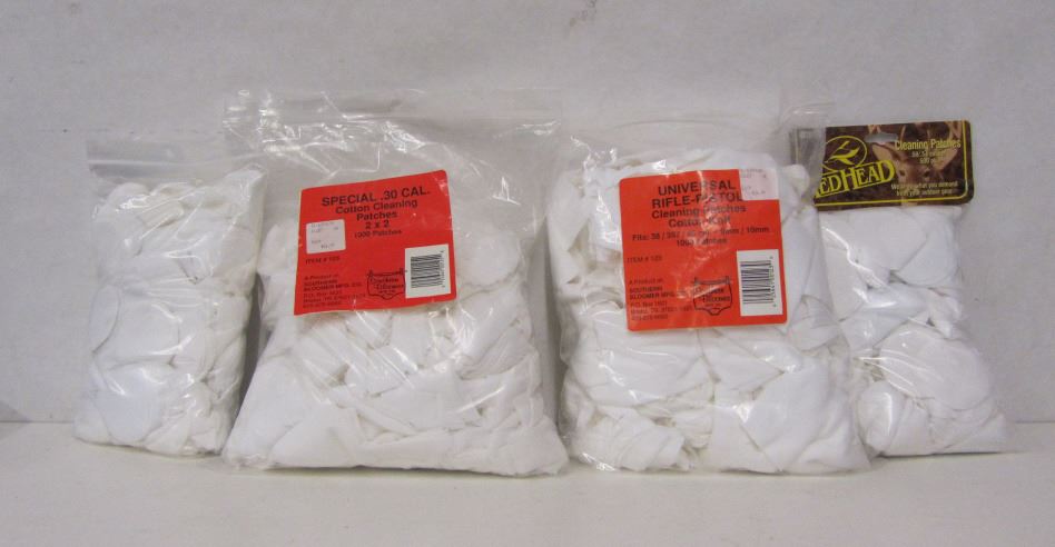TWO BAGS OF REDHEAD .50/.54CAL CLEANING PATCHES, ONE BAG OD .30CAL CLEANING PATCHES, ONE BAG OF UNIVERSAL RIFLE-PISTOL CLEANING PATCHES.
