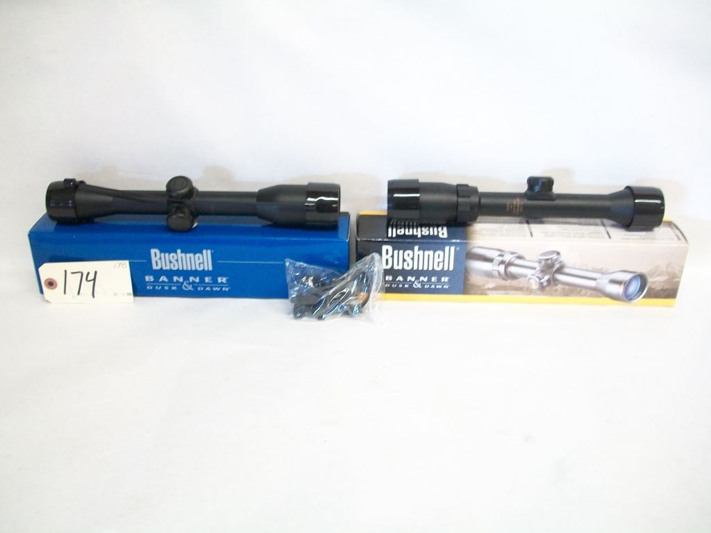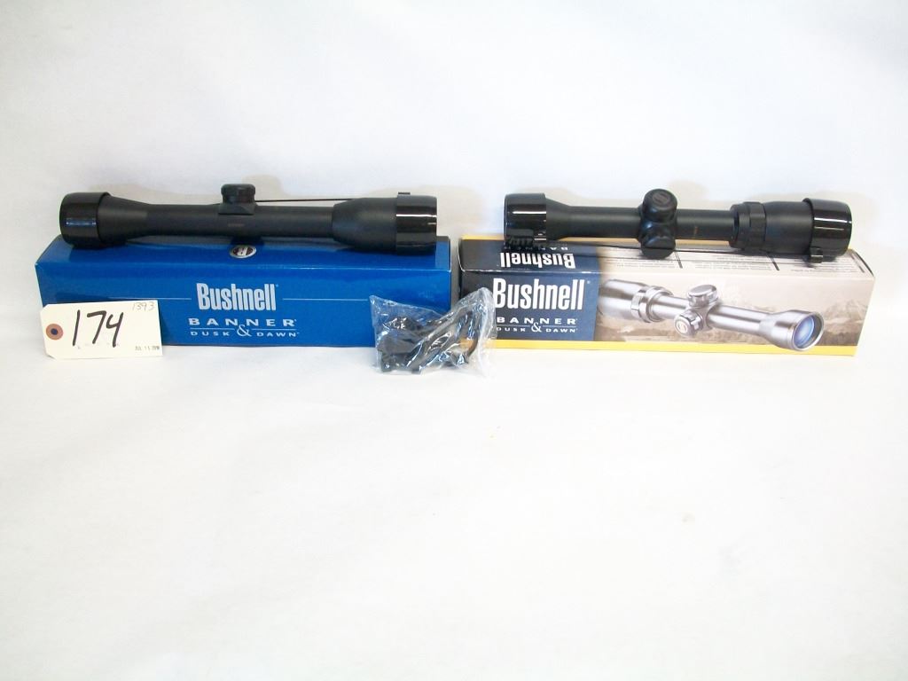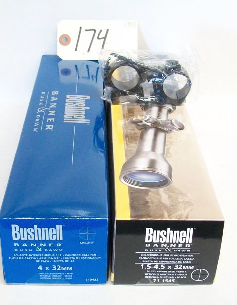 TWO BUSHNELL BANNER DUSK & DAWN SCOPES ONE IS A 4 X 32 RIFLE/SHOTGUN AND ONE IS A 1.5 X 4.5 X 32 SHOTGUN SCOPE BOTH APPEAR TO BE NEW IN BOX, A SET OF 1" SCOPE RINGS