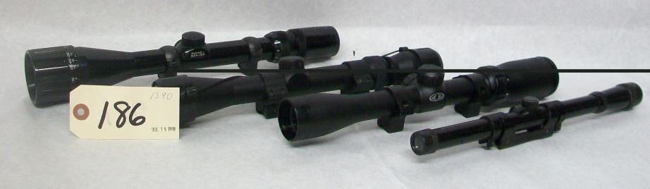 TASCO 4X15 .22 SCOPE WITH MOUNT FOR 3/8 DOVETAIL, BUSHNELL SPORTSMAN 3-9 X 32 WITH 3/8 MOUNTS FOR GROOVED RECEIVER, TASCO MAG 3-9 X 32 WITH 3/8 MOUNTS, BUSHNELL BANNER 4-12 X 40 WITH 3/8 STEEL RINGS ADJUSTABLE OBJECTIVE.