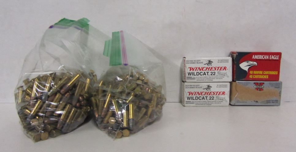 TWO BAGS OF 22LR MIXED AMMO AND SMALL AMOUNT OF BRASS TOTALLING ABOUT ABOUT 645 PIECES, TWO 50 ROUND BOXES OF WINCHESTER WILDCAT 22LR 40GR LEAD ROUND NOSE, ONE 50 ROUND BOX OF WINCHESTER SUPER-X 22LR 40GR LEAD LUBALOY COATED, ONE PART BOX OF AMERICAN EAGLE 22LR 38GR HOLLOW POINT WITH 10 ROUNDS.