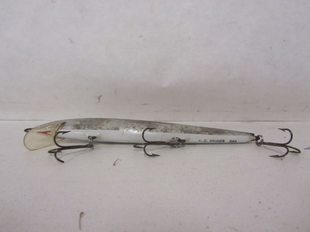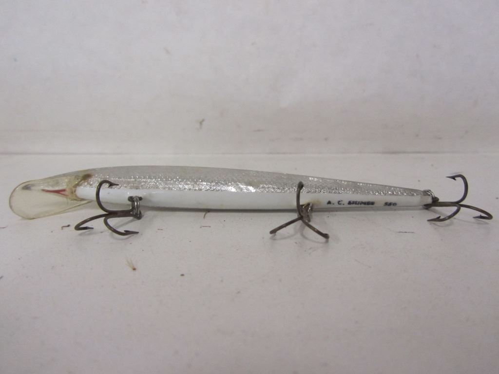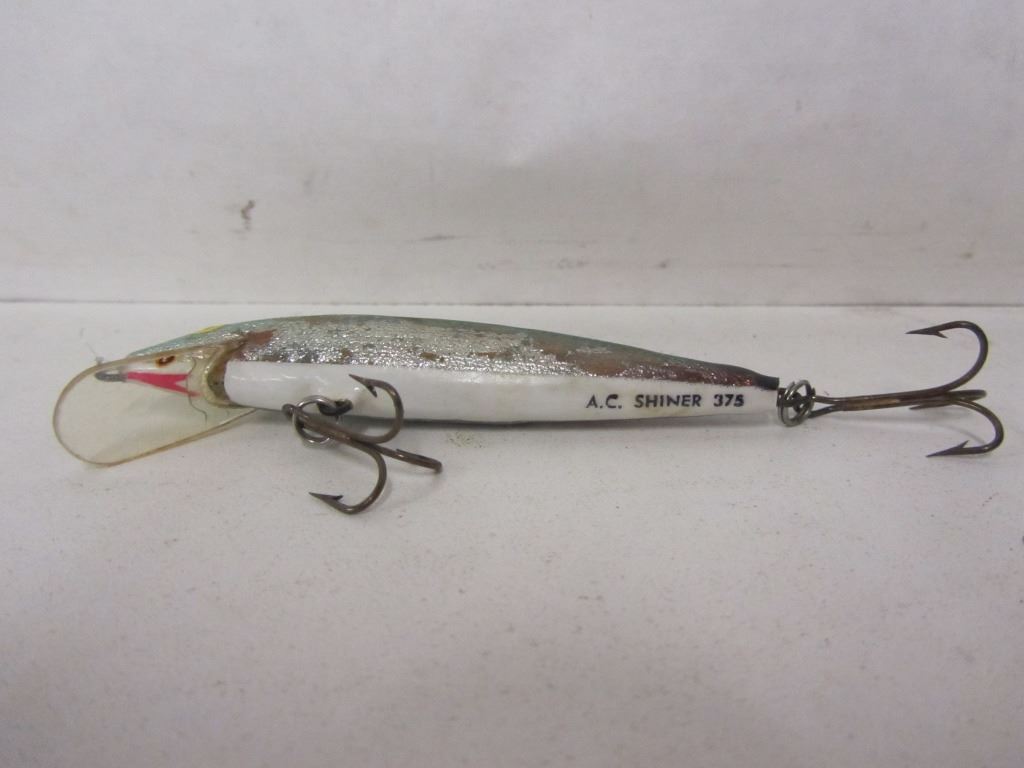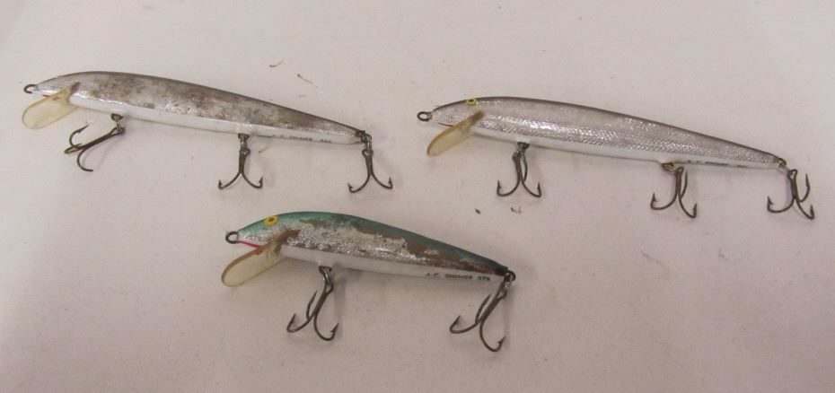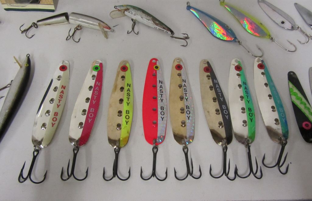 THREE A.C. SHINERS, ONE RAPALA J-11, TWO RAPALA THREE HOOK FLOATING LURE, ONE OLD TIME FAVORITES HOOLA POPPER, EIGHT NASTY BOY SPOONS, PLUS 12 OTHER SPOONS, TWO JIGGERS, EXTRA HOOKS, AND ONE WEIGHT. ALL IN PLASTIC BAIT BOX
