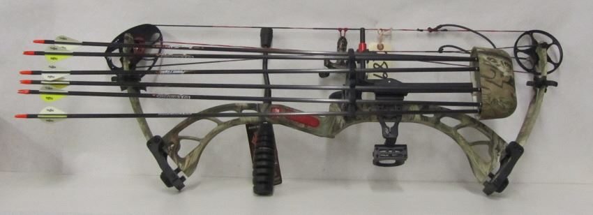 PSE BRUTE COMPOUND BOW, 25-30" DRAW LENGTH, 60# DRAW WEIGHT, 31" AXLE-AXLE, 75% LET OFF, SIX EASTON POWERFLIGHT 500 ARROWS, AND A TRUFIRE T-HANDLE RELEASE. RIGHT HANDED.