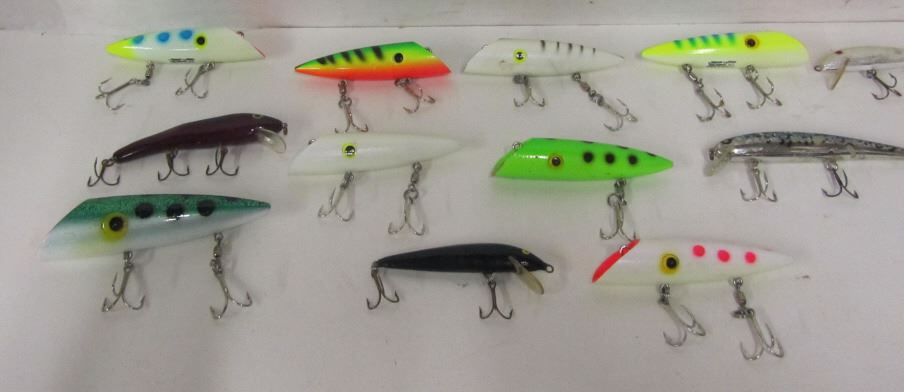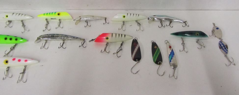 A.C. SHINER FLOATING LURES, LYMAN PLUG LURES, RED EYE SPOONS