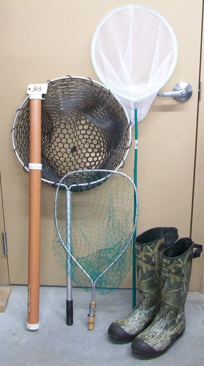 Lot 303 FISHING NETS, BOOTS AND ROD HOLDER.