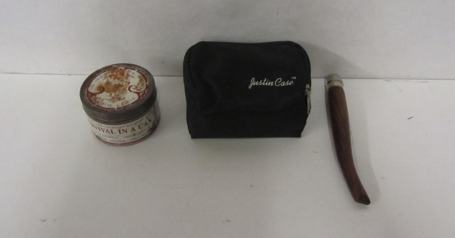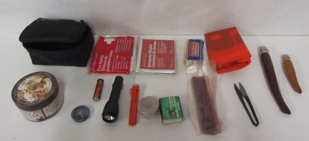 PURE BEESWAX SURVIVAL CANDLE, TWO KNIVES, ONE PAIR OF SCISSORS. JUSTIN CASE SURVIVAL BAG CONTAINING SESAME SNAPS, EMERGENCY BLANKET, "CALL POLICE" BANNER, FIRST AID KIT, EXACTO KNIFE, FLASHLIGHT AND AA BATTERY, WATERPROOF MATCHES AND FIRESTICKS, SMALL TEA CANDLE, COMPASS.