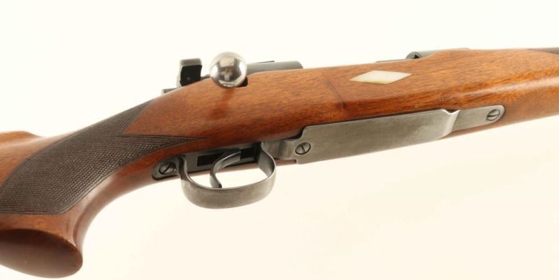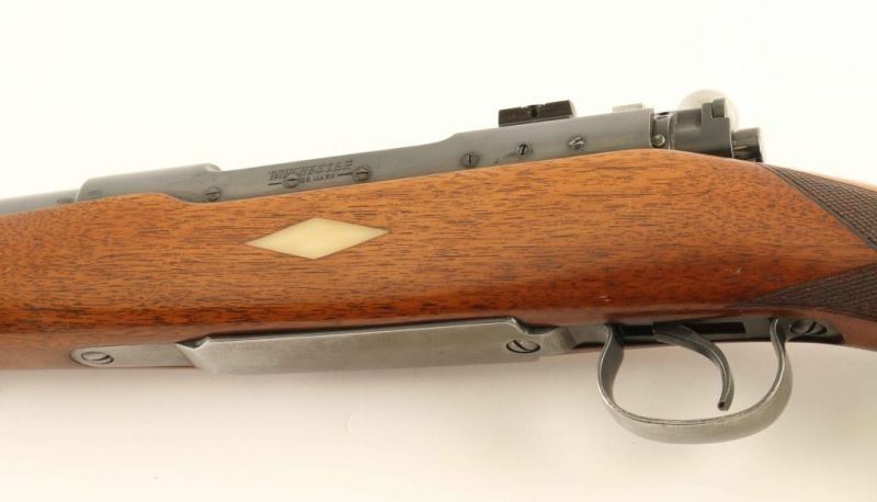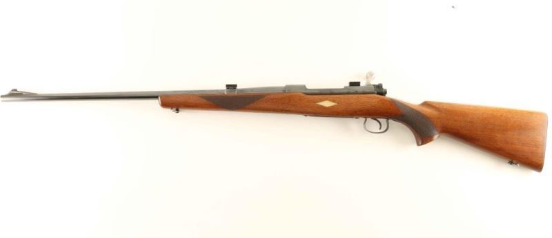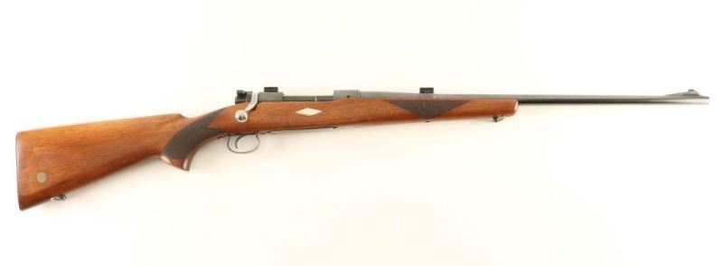 Desirable high quality bolt action sporting rifle chambered in .22 Hornet, manufactured circa 1935. The model 54 was the Winchester's first bolt action rifle built to handle heavy high-velocity ammunition, production lasted from 1925-1936 with just over 50,000 produced. Features a blued finish, 24" tapered barrel, ramped blade front sight with bead top, installed scope blocks in the rear sight dovetail & on the rear of the receiver, drilled & tapped receiver, serrated trigger, polished bolt with three-position safety, non-detachable box magazine, sling swivels and checkered walnut pistol grip shoulder stock with white diamond inlays on either side of the action, a round bass escutcheon on the right side of the stock & knurled metal buttplate. Rifle exhibits approximately 80% of it's original finish showing heavy wear on the trigger guard & floorplate, some thinning & handling marks on barrel forward of the stock and a very small amount of emerging surface rust on the receiver. Action is smooth, the bore is excellent, markings are mostly very good and the wood stock is good to very good with semi-worn checkering. Condition is NRA Good++. ***C&R Firearm***