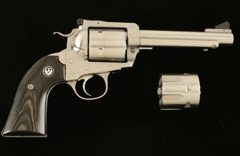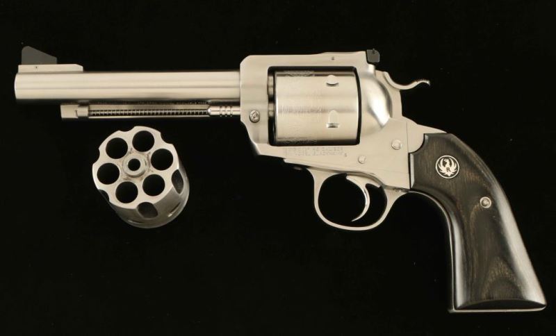 SN: 48-60747 'Bisley' American made stainless steel single action revolver with convertible cylinders chambered in .45 Colt and .45 Automatic, circa 2013. Features a brushed finish, 5 1/2" barrel, raised ramp front sight, adjustable rear sight, ejector rod, non-fluted six shot cylinder with roll-stamped 'BISLEY MODEL' & floral scroll embellishment, transfer bar safety, serrated wide low-profile hammer spur, smooth trigger, humpback backstrap, and two-piece smooth green laminated wood grips with Ruger medallions. Includes the original factory hard case with manual and a fluted .45 ACP convertible cylinder. Revolver exhibits only light handling marks, a drag line on the cylinder and two small dings on the left side of the barrel below the front sight. Action is smooth with good lock-up, bore is pristine and wood grips are fine. Likely unfired. Condition is NRA Excellent in case. ***Modern Firearm***