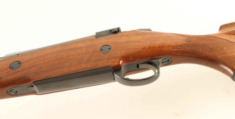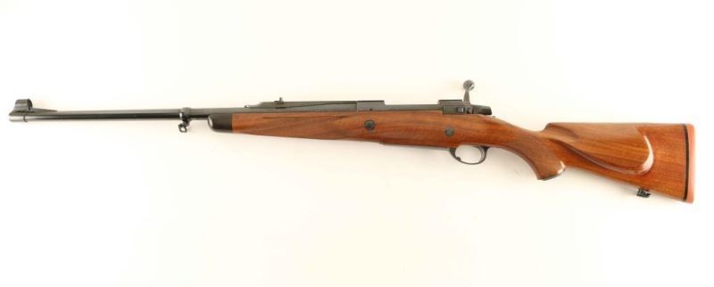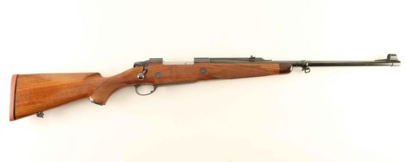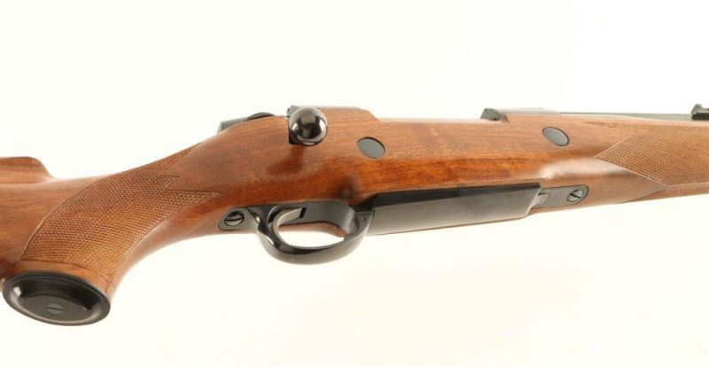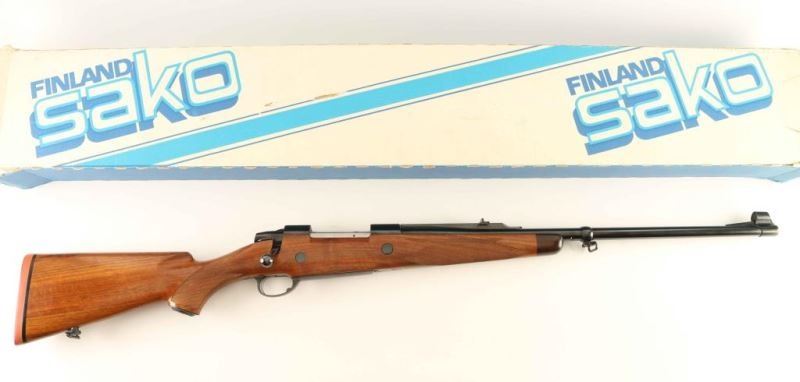 High quality Finnish made bolt action sporting rifle chambered in 9.3x62mm, manufactured circa 1980's. Imported by Stoeger Inc. of N.J. with import mark on the underside of the barrel. Features a blued finish, 22 7/8" barrel, ramped & hooded blade front sight with brass bead, one leaf express sight, integral scope rail cuts in the receiver, smooth trigger, cocked indicator, manual safety on the right side of the receiver, internal box magazine with hinged floorplate, stainless steel bolt, sling swivels and checkered Monte Carlo style walnut stock with dark wood forend tip & Old English recoil pad. Includes the original factory cardboard box with documents. Rifle exhibits approximately 99% of it's original finish and shows four small dings in the top of the barrel. Action is smooth, bore is pristine and the wood stock is fine. Condition is NRA Excellent. ***Modern Firearm***