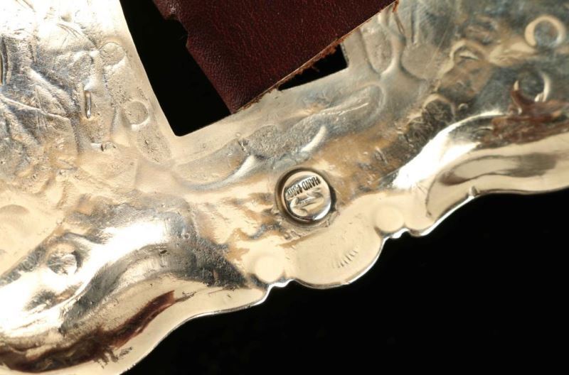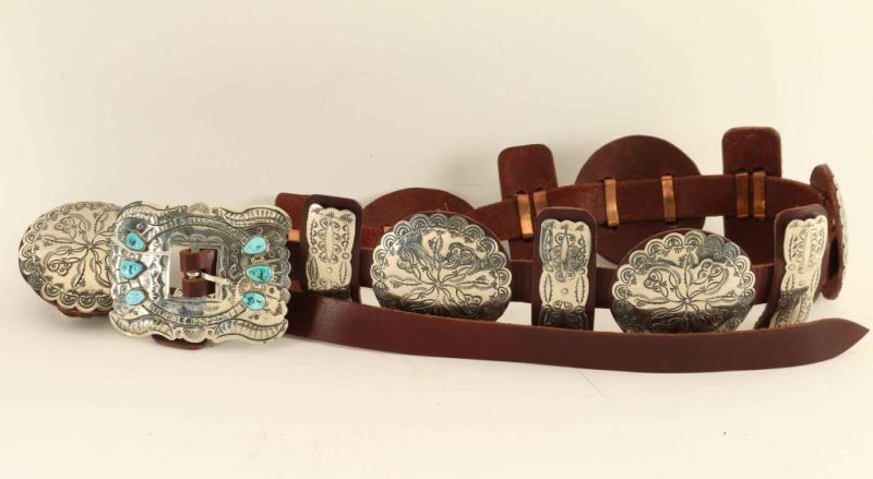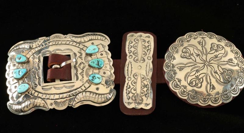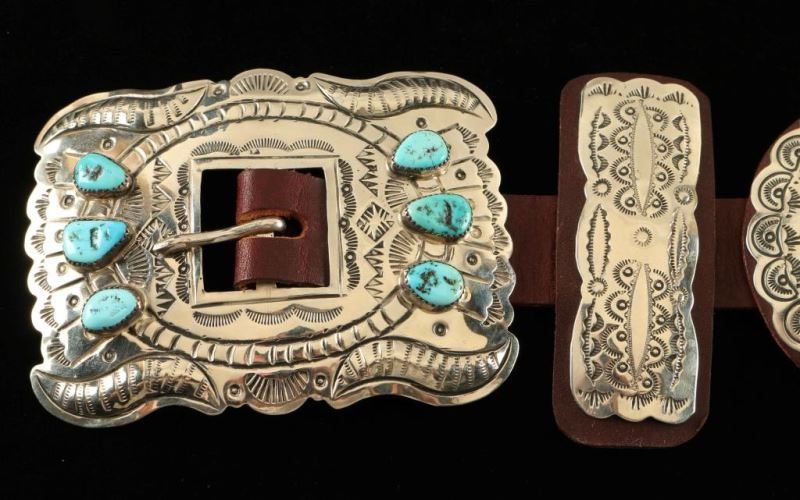 Hammered silver with Sleeping Beauty Turquoise accents. Seven 3" wide rounds and eight 3" by 1" butterflies are stamped with traditional Native American designs and are leather backed and threaded on a 7/8" wide smooth brown leather. The 4"x2" buckle displays six Sleeping Beauty nuggets on bumped out and stamped metal. Hand worked from German silver by Jimmy Emerson and Joey McCray. It's stamped 'Handmade' and hallmarked.