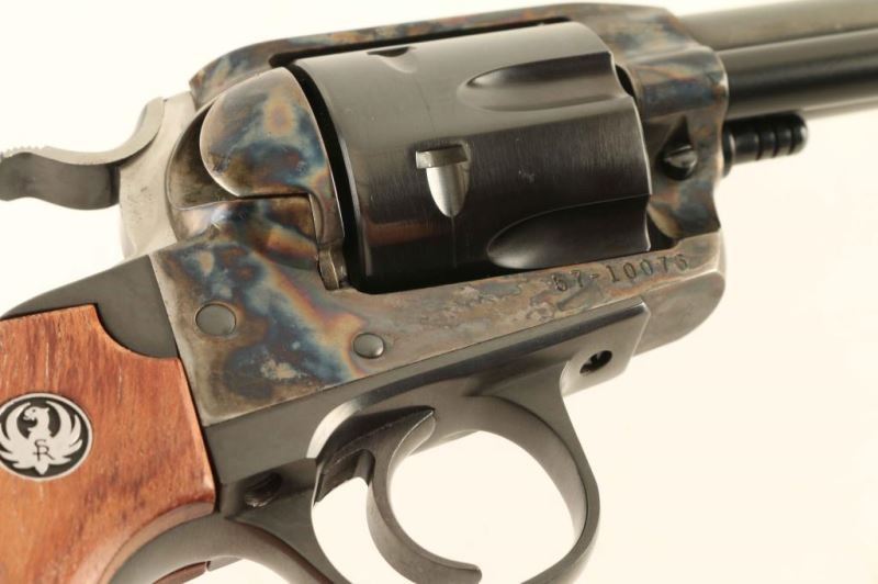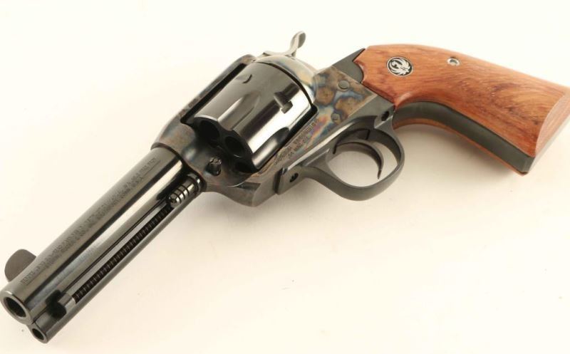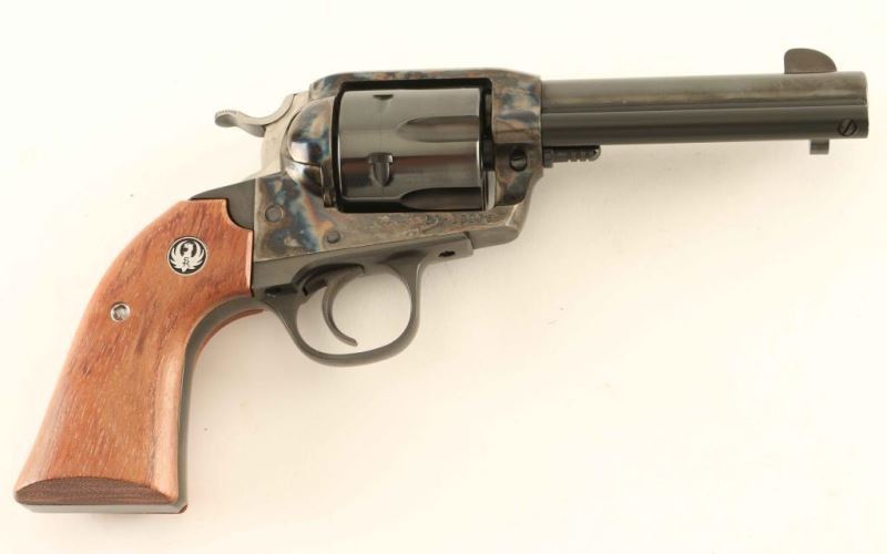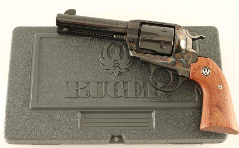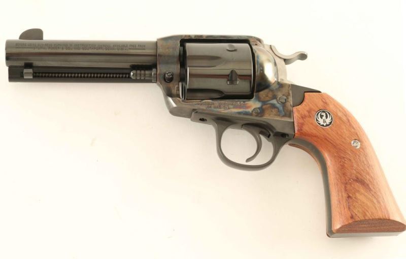 'Bisley' American made single action six-shot revolver chambered in .44 Magnum, circa 1999. Features a blued/case hardened finish, 4.62" barrel, blade front sight, square notched rear sight, ejector rod, smooth trigger, serrated wide low profile hammer spur, transfer bar safety, fluted cylinder, and two-piece smooth wood grips with Ruger medallions. Includes the original factory hard case with manual and lock. Revolver exhibits approximately 99% of it's original finish showing a light drag line on the cylinder and some minor handling marks. Action is smooth with good lockup, bore is pristine, and the wood grips are fine. Condition is near NRA Perfect in case. ***Modern Firearm***