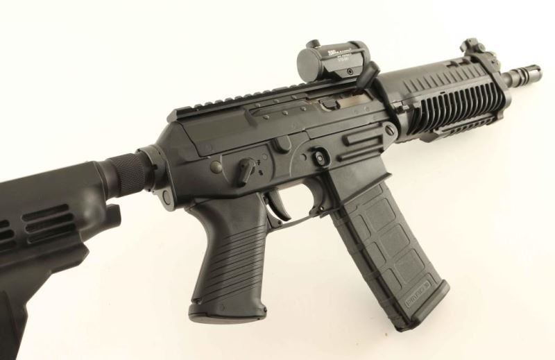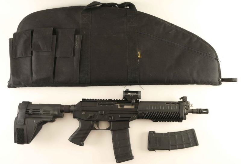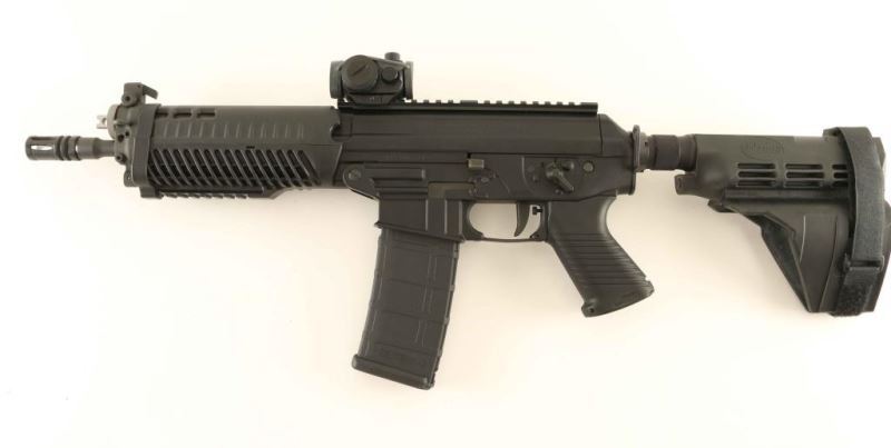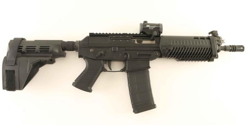 American made semi-automatic pistol variant of the SIG 550/553 piston driven rifles, chambered in 5.56x45mm NATO. Features a 10" button rifled barrel with 1/7 twist, A2 style birdcage flash hider, drift adjustable flip-up blade front sight, elevation adjustable flip-up aperture rear sight. black Nitron finished steel receiver with installed scope rail, Sig Sauer STS-081 red dot sight, adjustable gas system, provisions for a bayonet lug, black hard-anodized aircraft grade aluminum alloy trigger housing, adjustable two-stage trigger, push button magazine release, 30 round Pmag magazine, sling point end plate, ventilated black grooved hand guard & forend with accessory rail at 6 o' clock, black synthetic pistol grip with storage compartment and AR style pistol buffer tube with Sig Sauer stabilizing brace. Includes an Allen padded soft case with the P556 factory manual and spare magazine. The pistol exhibits approximately 98% of it's original finish showing very little wear. Action is smooth, bore is pristine, optics are fine and the synthetic stocks are excellent. Condition is NRA Excellent