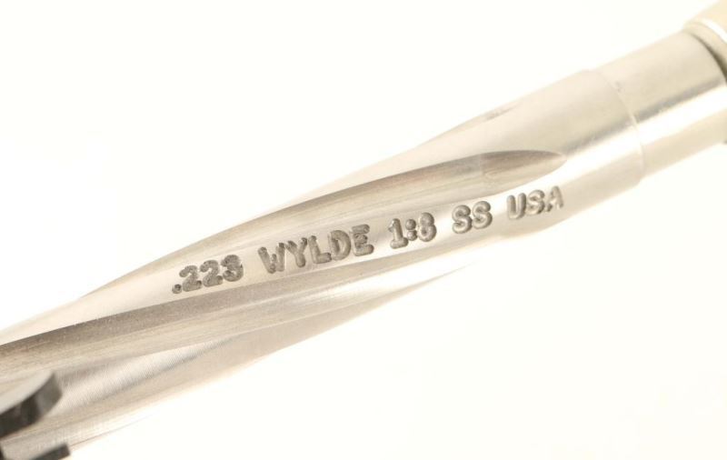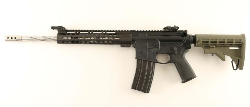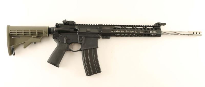 Custom semi-automatic AR platform rifle chambered in .223 Wylde, built by Ohio Forge using high quality parts. Features a heavy 16" stainless steel barrel with spiral flutes, compensator, slim 10" keymod free float handguard, flip-up iron sights, flat-top upper, dust cover, shell deflector & forward assist, standard charging handle, nickel boron bolt carrier group, ambidextrous safety, single stage trigger, push button magazine release, 30 round aluminum magazine, dual sling point end plate, black Magpul MOE pistol grip, mil-spec buffer tube and ODG six-position collapsible shoulder stock. Rifle shows little use or wear. Action is strong, bore is excellent and stocks are fine. Condition is NRA excellent. ***Modern Firearm***