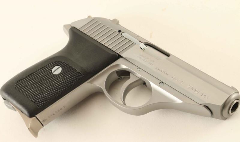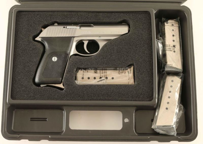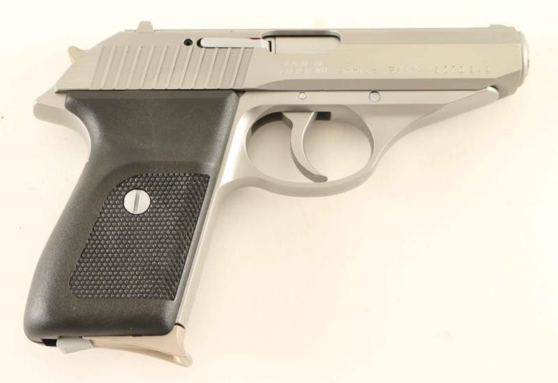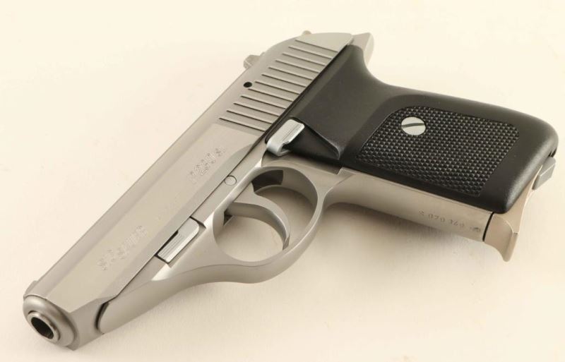 German made stainless steel double action semi-automatic compact pistol chambered in 9mm Kurz, circa 1996. Imported by Sigarms Inc. of Exeter N.H. with import marks on the right side of the slide. Features a brushed/matte finish, 3.6" barrel, fixed blade front sight with orange dot, dovetailed rear sight with orange bar, smooth trigger, serrated round hammer spur, thumb decocking lever, heel magazine release, factory 7 round magazine with finger rest floorplate and two-piece checkered black synthetic grips. Includes a factory hard case with manual, test target and three spare magazines. Pistol exhibits no visible signs of use or wear. Action is smooth, bore is pristine and the synthetic grips are fine. Likely unfired. Condition is NRA Perfect. ***Modern Firearm***