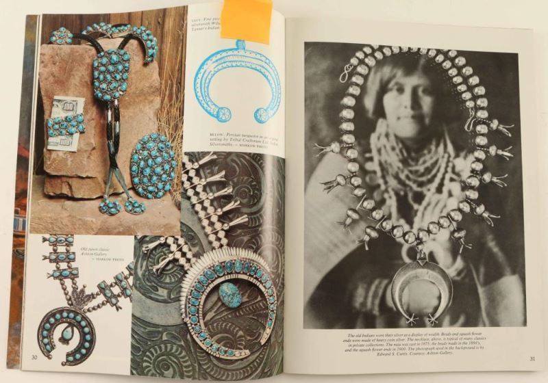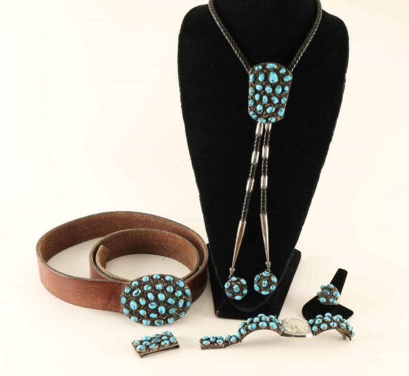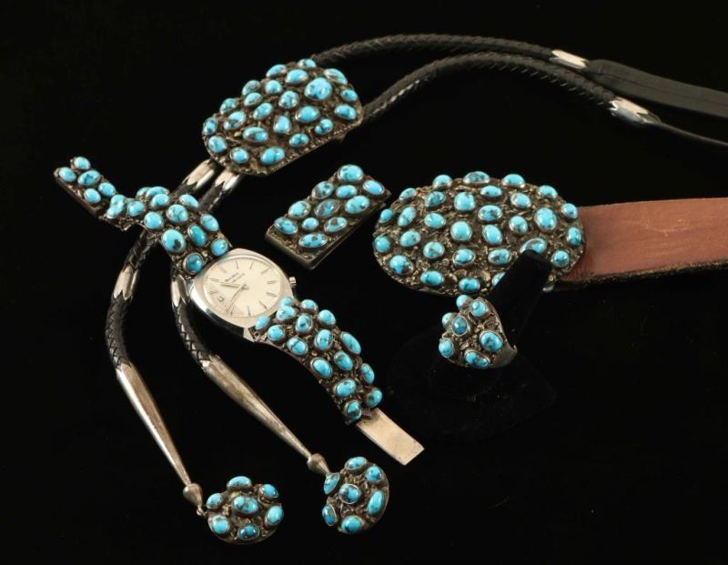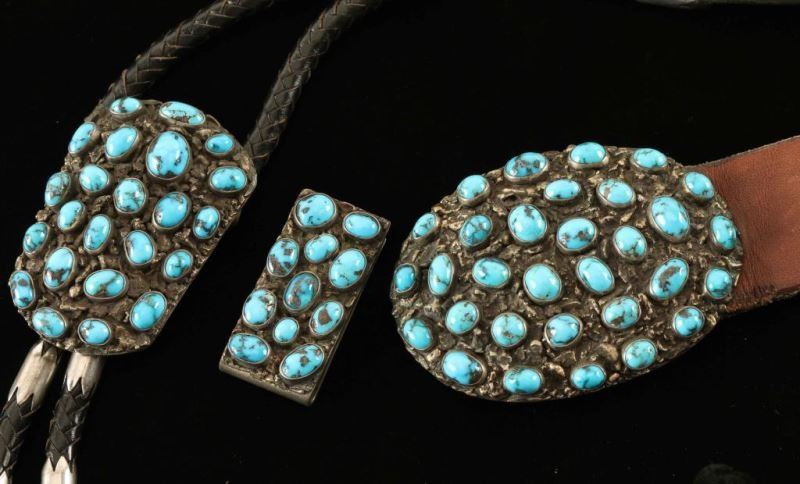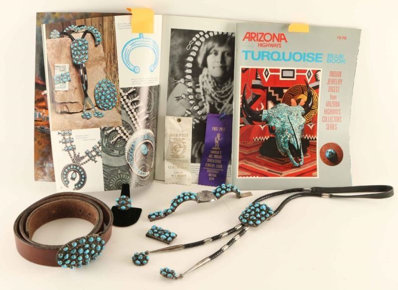 First place ensemble made by Wilson Tsosie showcased in Arizona Highways magazine. Oval sterling silver buckle with thirty small turquoise stones-unsigned on a smooth brown leather belt, bolo tie with twenty three turquoise stones signed 'W Tsosie' on black braided leather with round sterling ends that also have turquoise stones, men's ring of same design with seven stones signed 'W Tsosie', sterling and turquoise money clip signed 'W Tsosie' and a sterling and turquoise watch band with Bulova watch face signed 'W Tsosie'. Also includes two issues of Arizona Highways that feature the ensemble, First Prize ribbon from Tanner's All Indian Invitational Jewelry Show in Scottsdale, AZ 1974, and a Third prize ribbon from the Inter-Tribal Indian Ceremonial in Gallup, NM 1974.