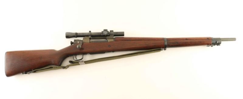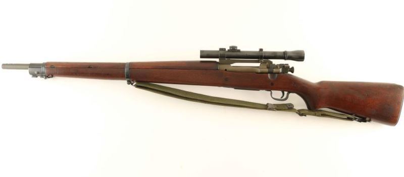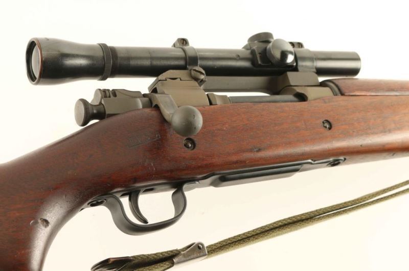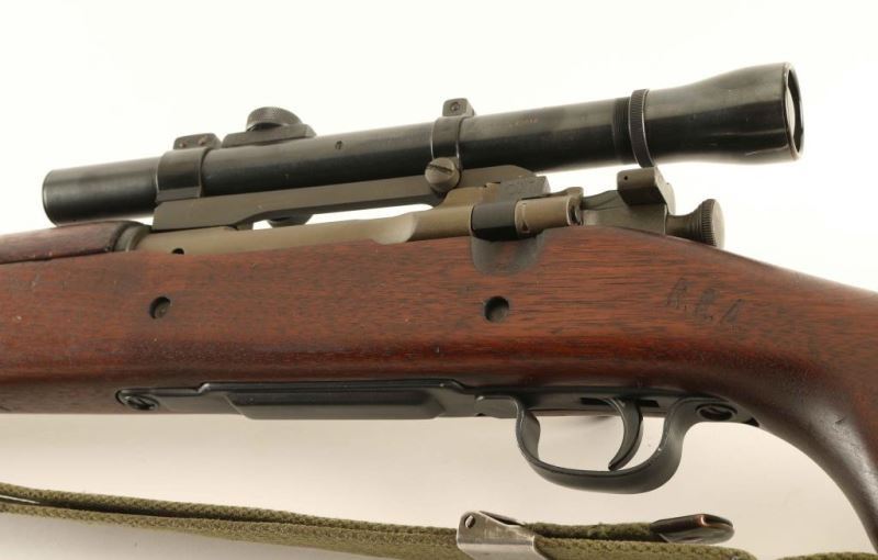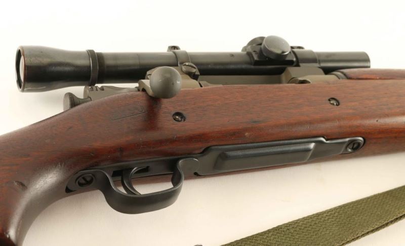 U.S. Military contract bolt action service rifle modified to emulate the 03-A4 sniper rifle, chambered in .30-06 Springfield and manufactured circa 1943. Features a parkerized finish with some blued parts, 24" barrel marked "RA/[flaming bomb]/9-43", omitted front sight, Lyman Alaskan 2.5x scope on a one-piece scope base with flaming bomb cartouche, modified bolt handle, bayonet lug, two barrel bands, smooth trigger, three-position safety on the bolt, 5 round internal box magazine with stamped metal floorplate, magazine cut-off switch, green canvas sling, smooth full-length walnut handguard and pistol grip shoulder stock with knurled trapdoor metal buttplate & a "P" in a box, "R.R.A" & "C-S.S.A." in a box markings. The receiver is stamped with the standard 03-A3 marking but the serial number has been restamped below the original set of numbers to be seen with the scope rail in place. Rifle exhibits approximately 95% of it's arsenal refinish showing little wear. Action is smooth, the two land bore is excellent, optics are clear and the wood stocks are very good. Condition is NRA Excellent as modified. ***C&R Firearm***
