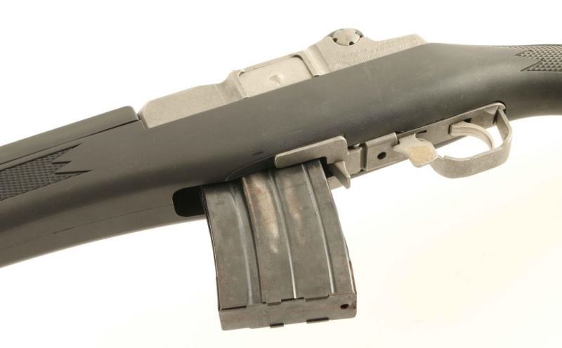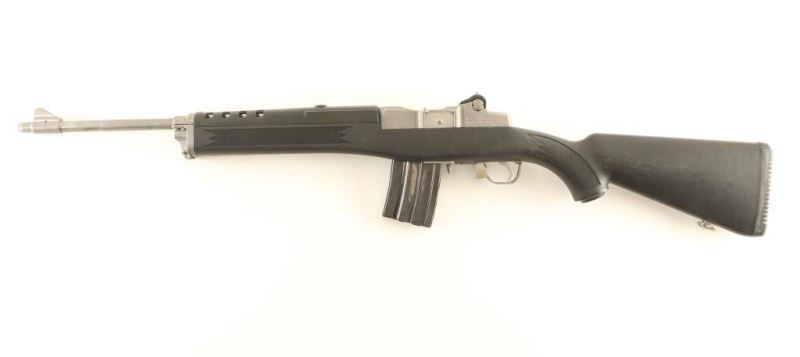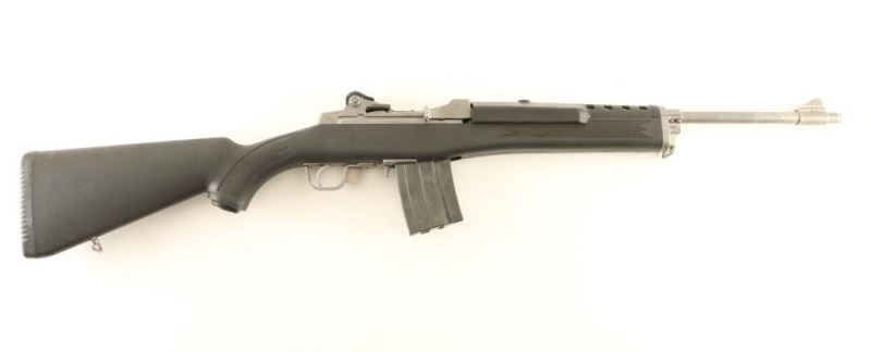 American made semi-automatic sporting rifle built along the lines of a scaled-down M14 and chambered in .223 Remington, manufactured in 2001. Features a matte stainless steel finish, 18.5" barrel, large blade front sight, adjustable rear aperture sight, smooth trigger, investment cast receiver, bolt hold open, factory 20 round magazine, manual safety, sling swivels, ventilated black polymer hand guard, and checkered black synthetic pistol grip shoulder stock with rubber recoil pad. Includes the original factory cardboard box stamped "USED FIREARM" in red and contains the manual, lock and scope rings. Rifle exhibits some bright scuffs on the barrel and shows nicks in the finish on the rear sight housing. The magazine shows significant wear and scattered light rust. Action is smooth, bore is excellent and the synthetic stock is very good with scuffs. Condition is NRA Very Good+++. ***Modern Firearm***