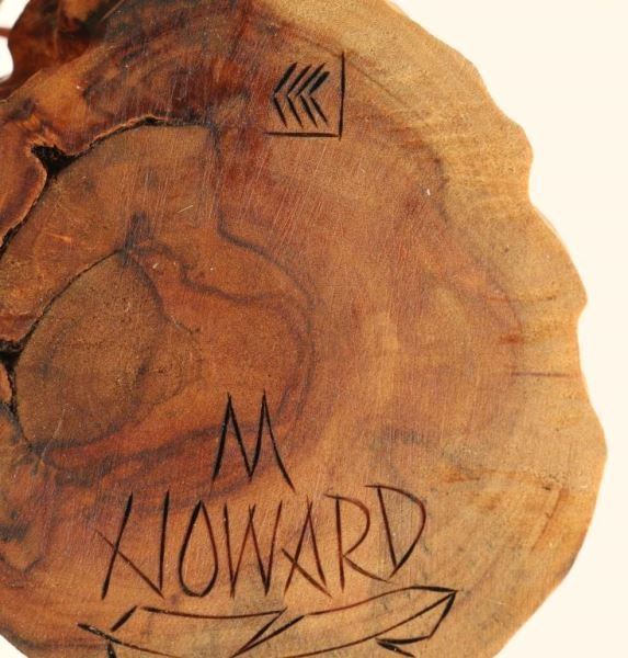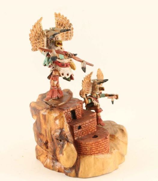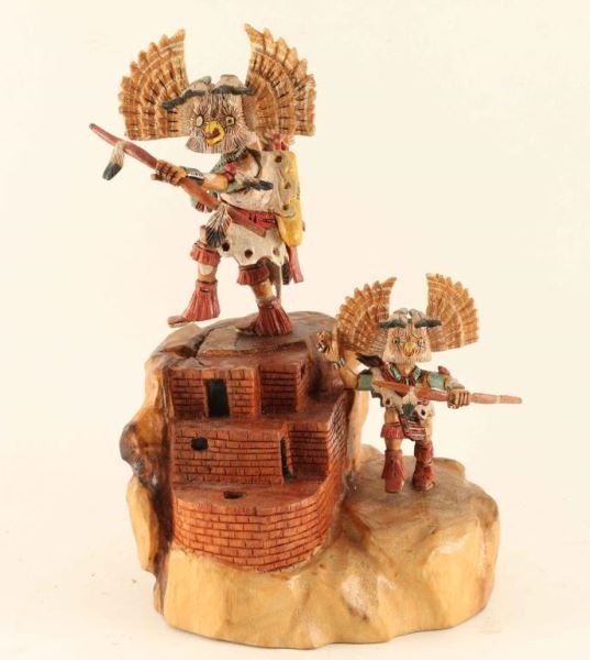 Made by Milton Howard, this includes a pair of Great Horned Owls carved in superb detail. From the fine lines of the feather work and the beaded jacla necklace to the pueblo building the dancer stands on. Milton uses stain to bring out the natural wood grain of the cottonwood root, along with paint to enhance the detail. It's 8" tall, 5 1/4" wide and 4 1/2" deep. Signed and named. This Hopi Owl Kachina Doll is hallmarked under the base.