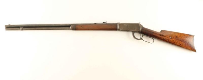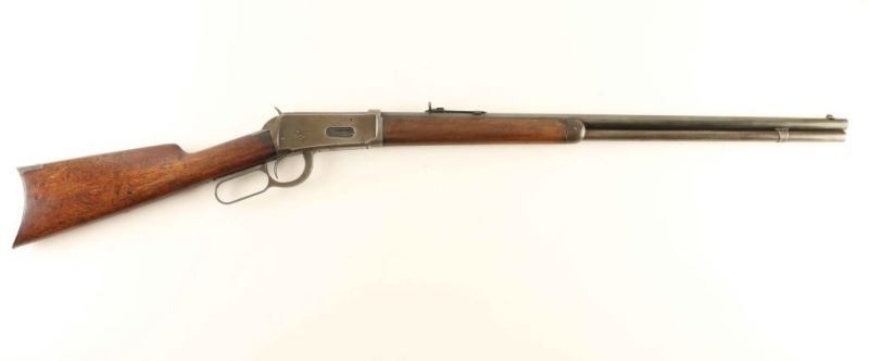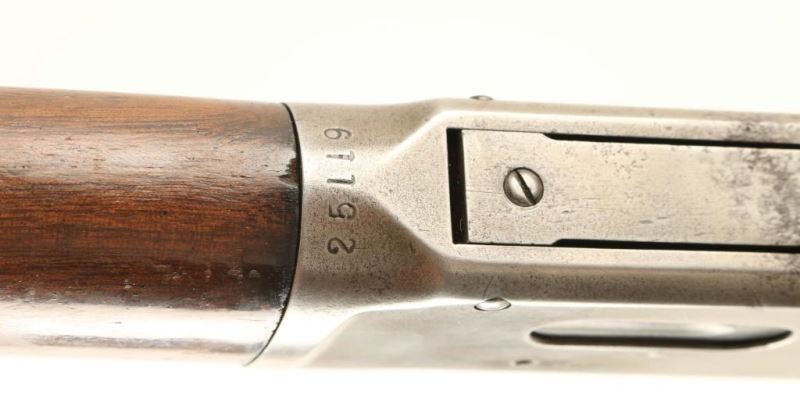 Early lever action repeating rifle chambered in .30-30 Winchester, circa 1895(second year production). Features a blued finish, 26" barrel, full length tube magazine, dovetailed blade front sight, adjustable semi-buckhorn rear sight, smooth trigger, knurled hammer spur, grip safety, smooth walnut forend and straight grip shoulder stock with crescent metal buttplate. The barrel & magazine tube exhibit a nice smooth grey patina with less than 10% of it's original finish retained in the protected areas. The receiver shows a browning patina with some light scattered pin prick pitting observed towards the bottom. The action is sound, the bore shows a dark ring a few inches from the muzzle but otherwise is in good condition, the markings are good and the refinished wood stocks are fair with some small losses & repairs. Condition is NRA Good. ***Antique Firearm***