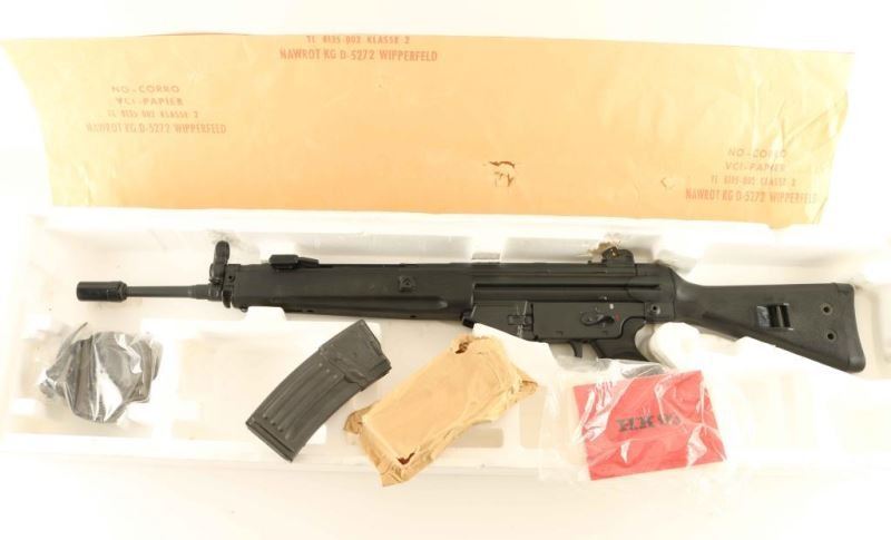 'Pre-Ban' Mint German made semi-automatic variant of the HK33 assault rifle chambered in 5.56mm NATO, circa 1982. Imported by HK Inc. of Arlington, V.A. with import stamp on the right side of the receiver. Features a matte black finish, 16.25" barrel, flash hider, hooded post front sight, 4-position rear drum sight, folding charging handle, provisions for a bayonet, "01" marked grip frame with two-position selector, push button magazine release, "IB" dated 20 round steel magazine, black synthetic forearm, finger groove pistol grip and fixed should stock. Includes the original factory cardboard shipping carton with partial label, styrofoam inserts, manual, warranty card, sling, black plastic muzzle cap and kraft paper. Rifle retains approximately 99%+ of it's original finish showing minor handling marks with no major wear observed. Action is strong, bore is pristine, and synthetic stocks are fine. Likely unfired. Condition is NRA Perfect in box. ***Modern Firearm***