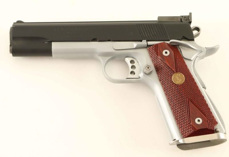 'MK IV Series 70 National Match' Desirable single action semi-automatic target pistol chambered in .45 Auto, circa 1978. Features a matte black finished slide, 5" N.M. barrel, ramp front sight, Bo-Mar adjustable rear sight, wide serrated trigger, skeletonized hammer with serrated spur, ambidextrous thumb safety, upswept beavertail grip safety, extended push button magazine release, factory 7 round magazine, stainless steel beveled magazine well, satin silver finished frame with serrated front strap, serrated arched mainspring housing and two-piece double diamond checkered wood grips with gold Colt medallions. Pistol exhibits approximately 97% of it's refinish showing light edge wear and some slide wear. Action is smooth, bore appears excellent but dirty and the wood grips are fine. Condition is NRA Excellent as refinished. ***Modern Firearm***